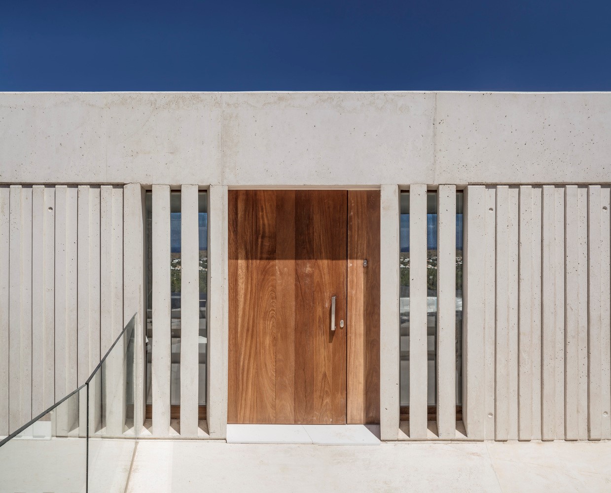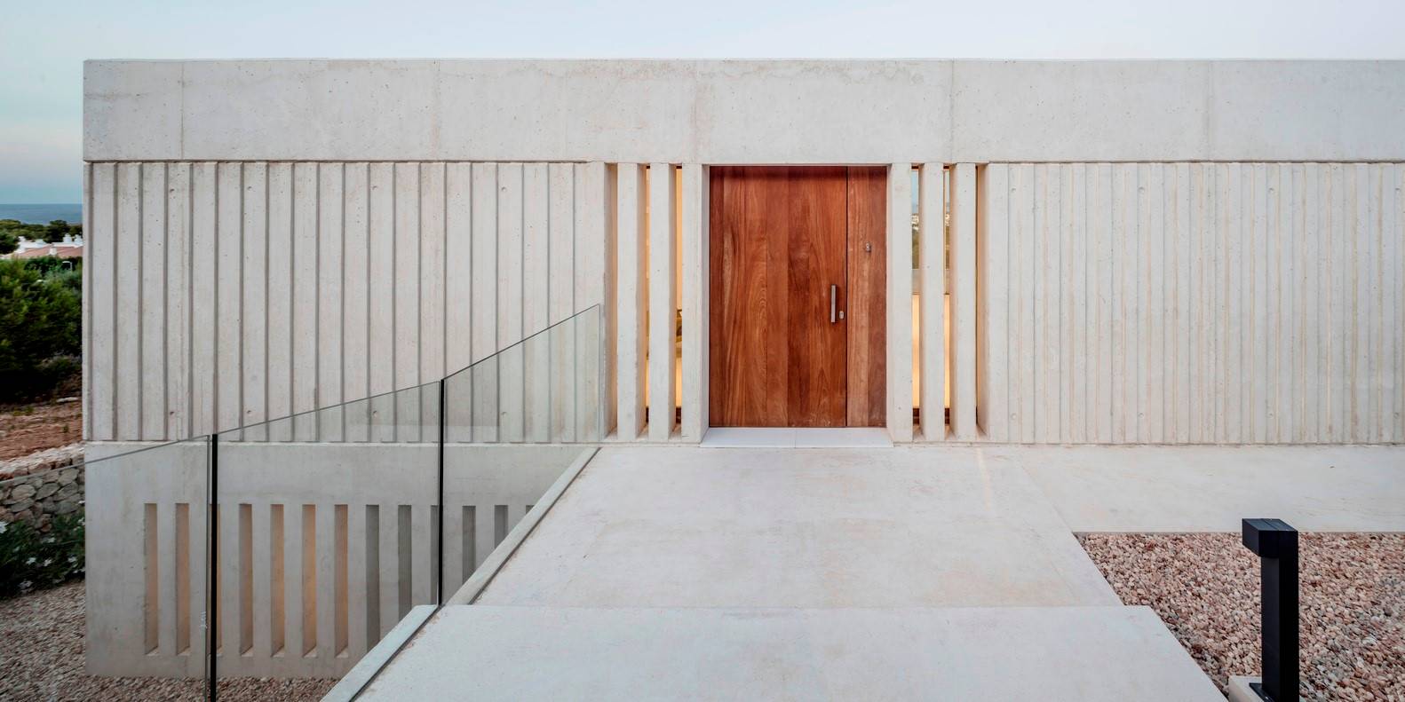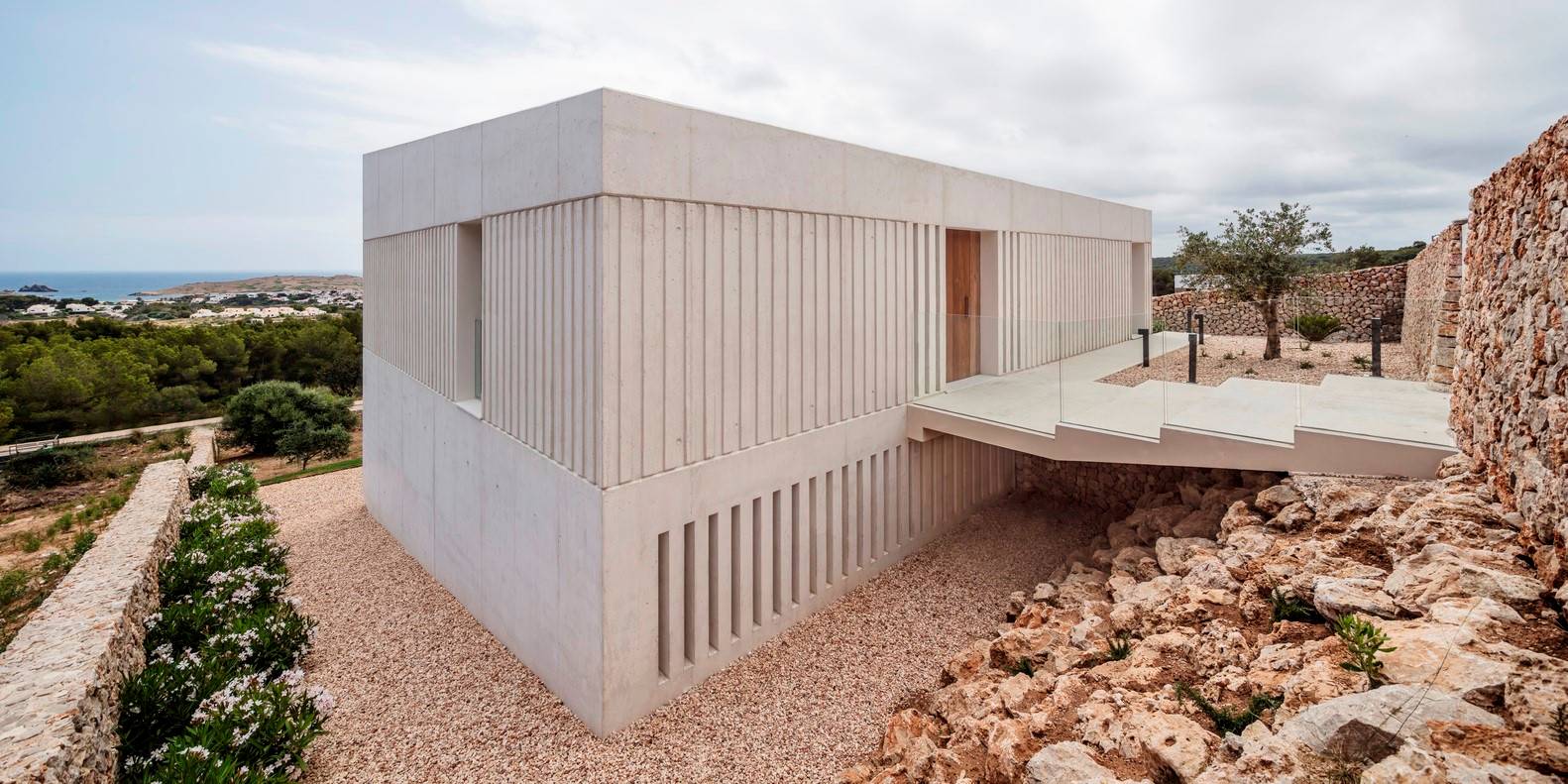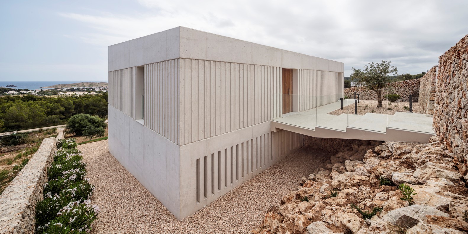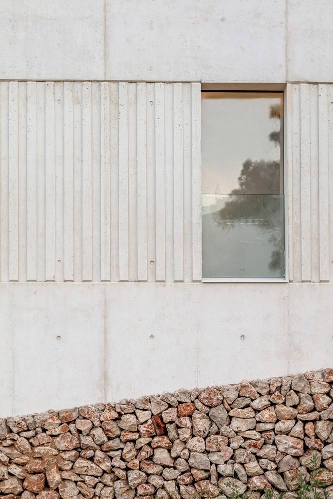 外立面選用現(xiàn)澆混凝土作為零維護材料,混凝土在梅諾卡島的高濕度和極端鹽水平的侵蝕性氣候中會很好地隨歲月老化得愈加迷人。房子的灰白色立面與房子周圍的赭色和赤土色土壤融為一體。最后,立面上的垂直條紋浮雕帶圍繞著門窗,使建筑立面在視覺上得到統(tǒng)一。