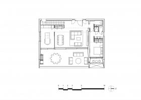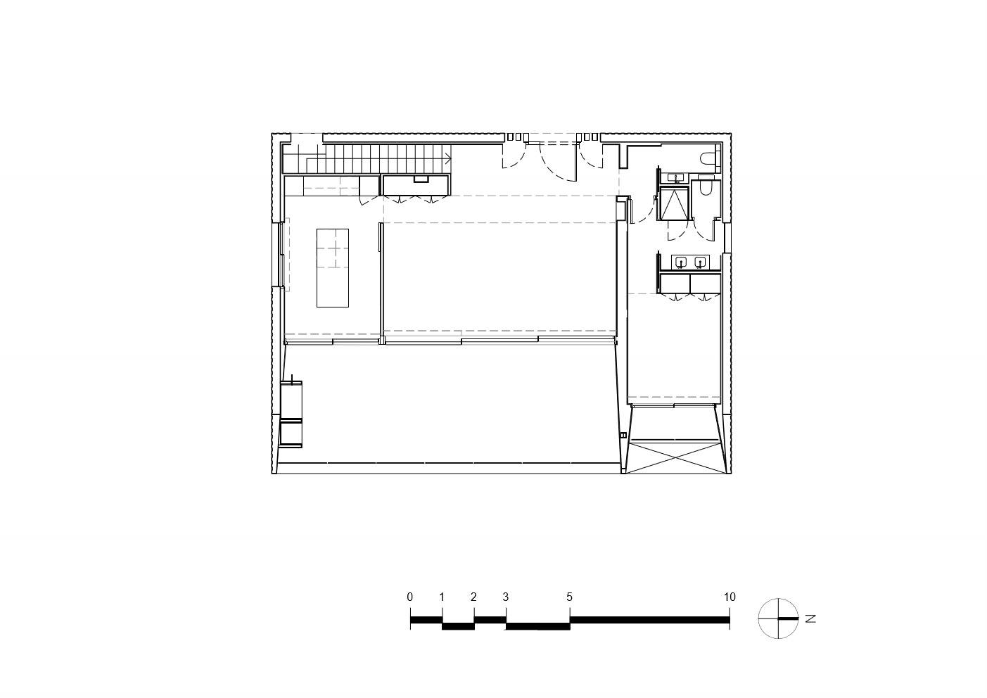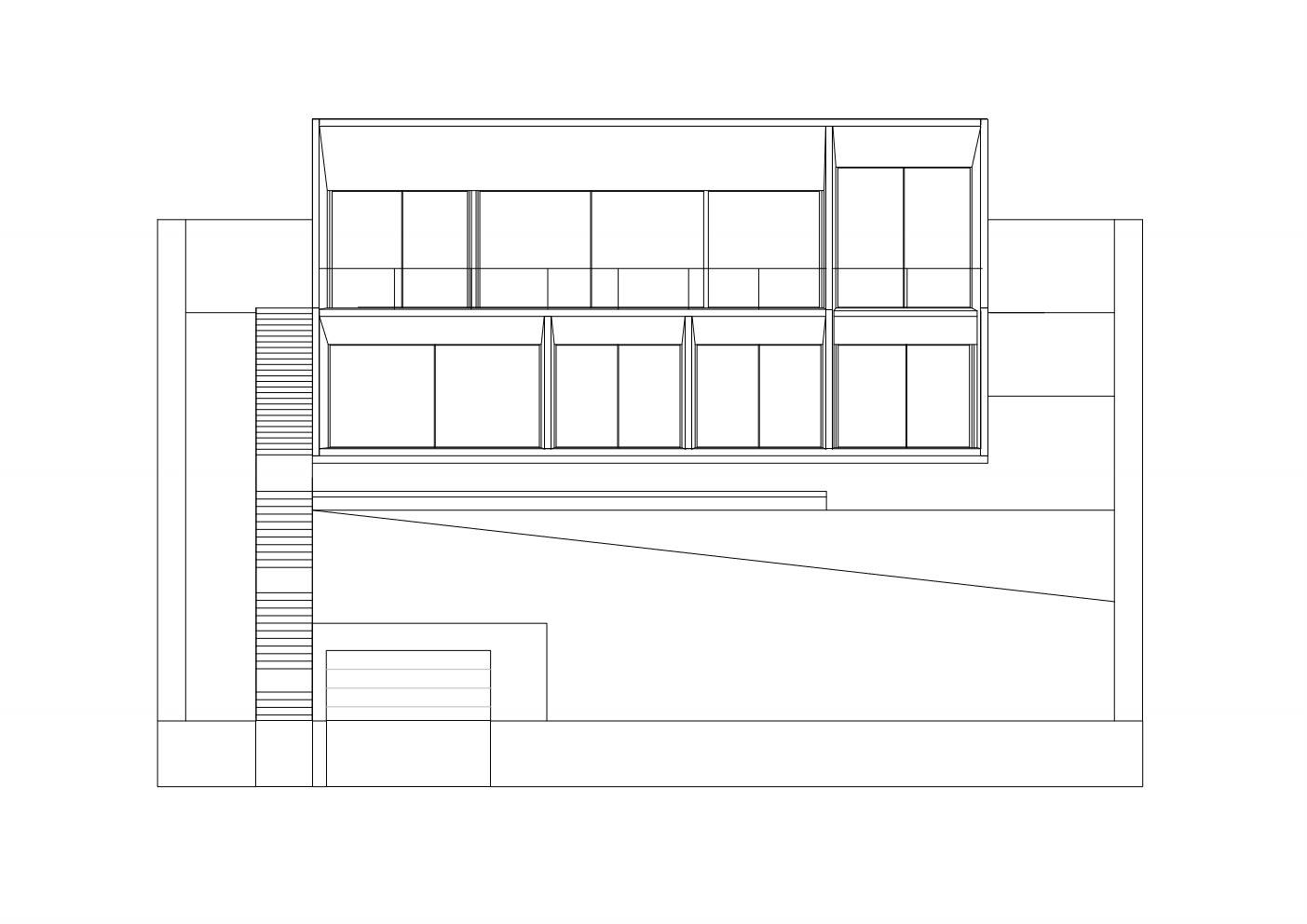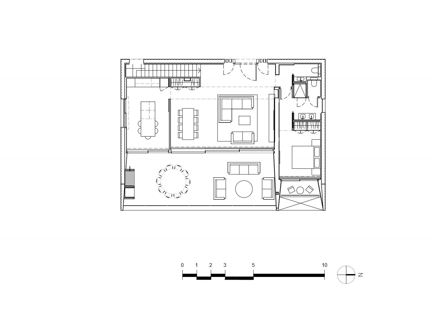 該地塊的陡坡和場地規(guī)則使得房屋選址的位置變得非常有限。為了避免前面的房子擋住海景視線,房屋被推到地塊的最高點,主入口位于一樓。為了進一步保持清晰的景觀視野,傳統(tǒng)的空間規(guī)劃模式被顛倒,使休息區(qū)與臥室位于地面層,只有主臥室在頂層,這是為了回應客戶的要求,他們想要一套夏季別墅,便于他們在周末短暫停留時開放,也許只有夫婦兩住在那里。這樣,房子可理解為是一個單層閣樓,為孩子和樓下的客人提供了一個可延伸空間。