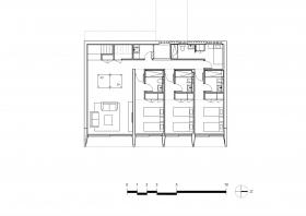 海景立面的開放性與側(cè)立面和背立面的不透明性之間的強烈對比產(chǎn)生了強烈的框架效果。為了進一步增強這種效果,屋頂傾斜向著視野開放,整個前立面從地板到天花板都有大型滑動窗戶。屋頂使用了通常只在工業(yè)建筑中使用的預制空心板,這使我們能夠創(chuàng)建一個11米的大跨度,創(chuàng)建出一個無柱露臺,使得觀景視線完全沒有受到干擾。一個預制元件被從屋頂上移除,形成了一個大型無框天窗,為無窗的背部帶來光線。