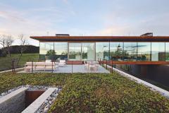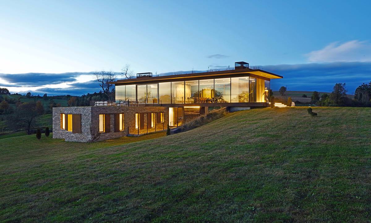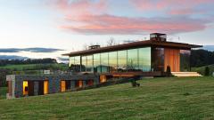 “上層體量基本上以全透明的方式最大限度地獲取外部景觀視野,而下層建筑則采用石塊與植物及藤蔓結(jié)合的方式最終與大地融合,”設(shè)計(jì)團(tuán)隊(duì)說道。一層酒吧的屋頂上覆土種植有嫩綠色的植物,有助于建筑與它周圍綿延的草色融為一體。該屋頂?shù)牧硪徊糠挚臻g用作露臺(tái),是主要起居空間的外部延伸。
