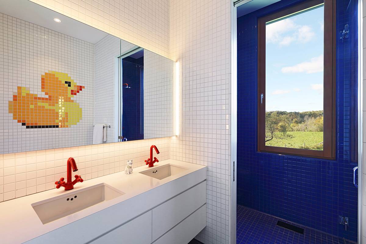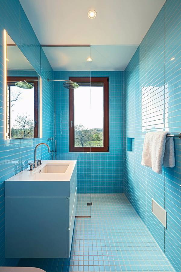 房間內(nèi)配有現(xiàn)代裝飾,比如真皮椅子和豪華的藍(lán)色沙發(fā)。在品質(zhì)要求較高的衛(wèi)生間中使用彩色的瓷磚覆蓋墻壁和地板,其中一個(gè)浴室內(nèi)還在浴缸旁的側(cè)墻上用明黃色的瓷磚排列出一個(gè)橡皮鴨的形狀。除了被動(dòng)式設(shè)計(jì)策略(如配備屋檐遮陽棚)的應(yīng)用,該住宅中還具有許多“主動(dòng)式”的可持續(xù)功能,例如輻射地板和用于加熱和制冷的地?zé)峋?。在未來幾年的時(shí)間里,家庭用電將通過光伏電池板提供,最終目標(biāo)是“住宅能夠脫離市政管網(wǎng)的能源供應(yīng)實(shí)現(xiàn)自給自足?!?/p>