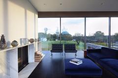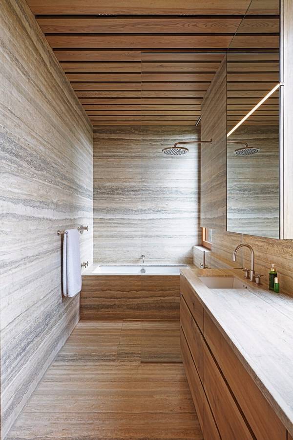 對(duì)于住宅的內(nèi)部空間而言,設(shè)計(jì)師主要采用了色調(diào)較為樸素的大地色材料進(jìn)行裝飾,比如大理石和木材。書房和濕衣放置室的飾面和木工制品使用櫻桃木制作。場(chǎng)地內(nèi)一些原有的樹木也用來制造主浴室的木制櫥柜和天花板。