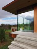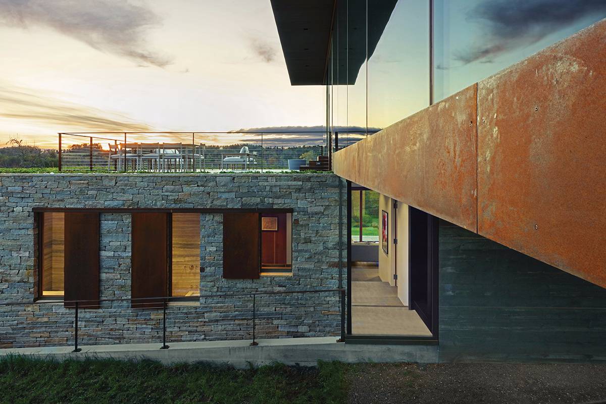 一層體量以當(dāng)?shù)氐氖淖鳛橥怙椕娌牧?,?nèi)部排布有五個(gè)臥室、一個(gè)家庭房間和一個(gè)書房。窗戶外部安裝有耐候鋼制成的百葉。