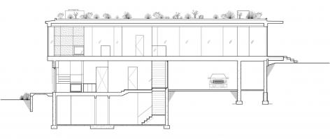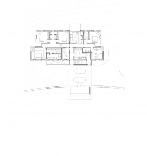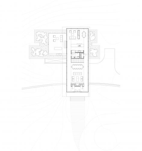 該住宅建在一個(gè)緩坡上,由兩個(gè)相交的體量組成,一個(gè)位于另一個(gè)之上。上方橋一樣的體量架在山丘之上,下方的山丘被挖空形成通道??盏貏偤糜米魍\囄?。這樣的排布形式使得一層空間相對(duì)隱蔽,只有在人們靠近住宅的時(shí)候才能發(fā)現(xiàn)這里 “別有洞天”?!?走近過程中視野所及的順序決定了這兩個(gè)體量呈現(xiàn)于眼前的順序,也就是說位于下方的體量在你到達(dá)住宅附近之前是無法看到的,”事務(wù)所說道。