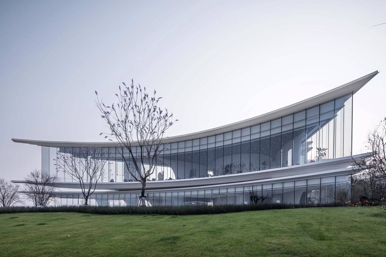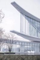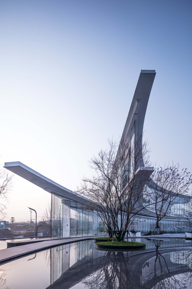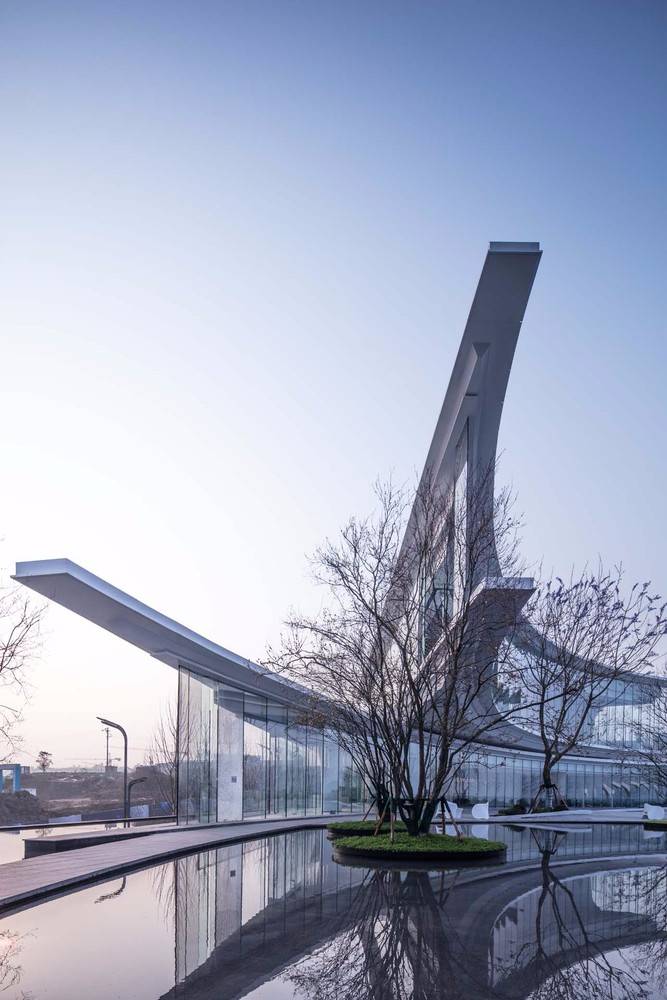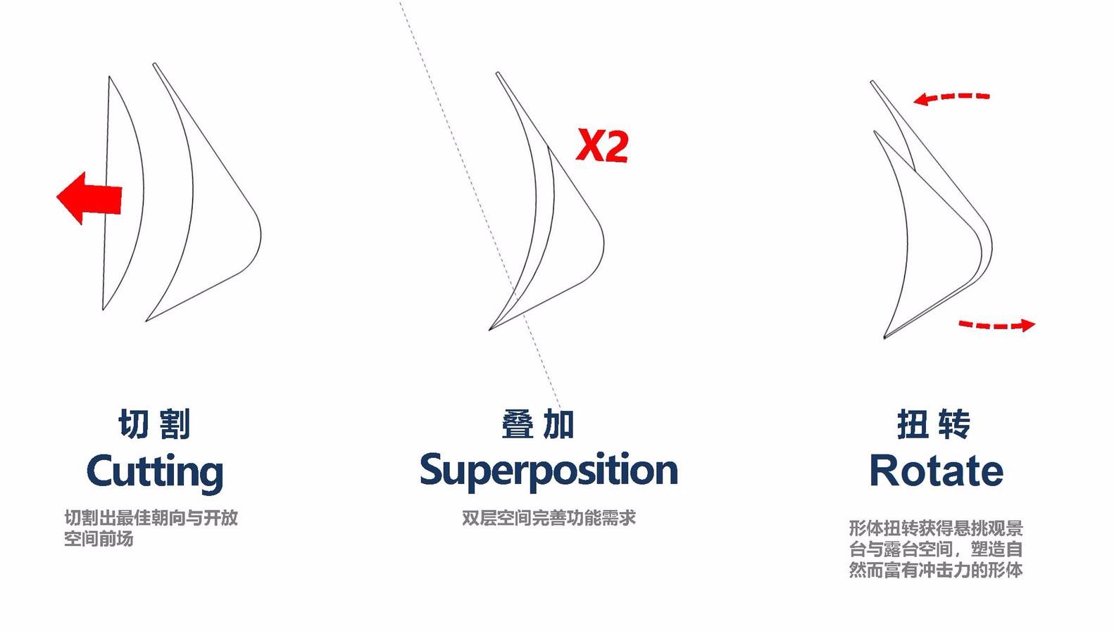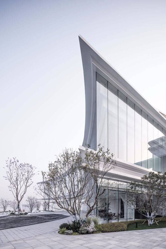 有限的設(shè)計語言被放大為懸崖、江灣、夕陽、和山形的運(yùn)用:建筑的整體形態(tài)復(fù)印江灣和山體的走向,用一條簡潔的曲線,塑造空中一道灣流。三角形的邊角地塊也因為一條弧形的切割,而表現(xiàn)出明確的方向性。