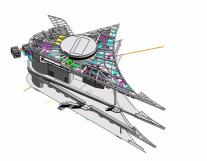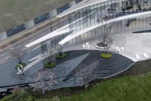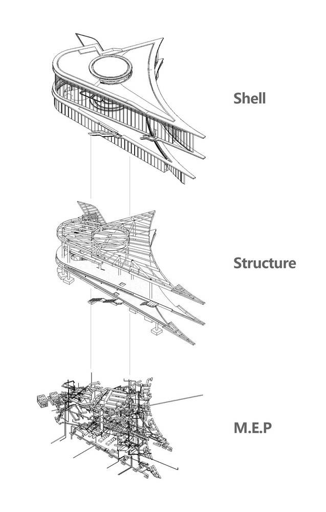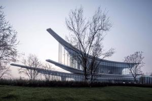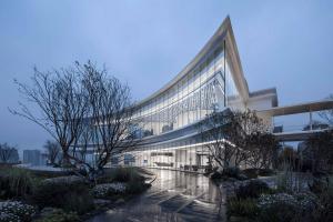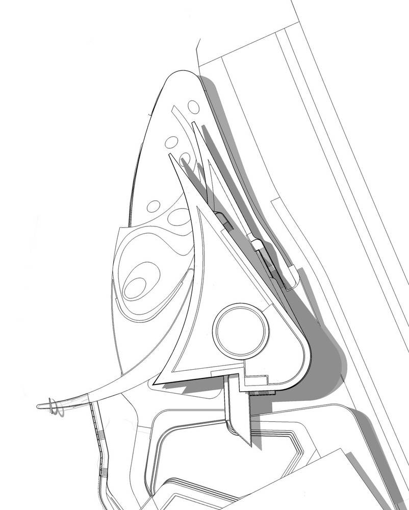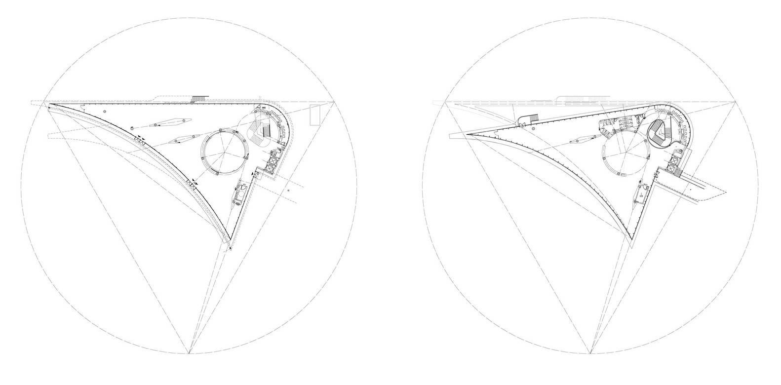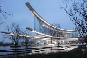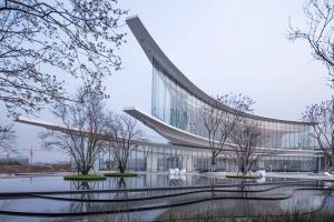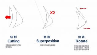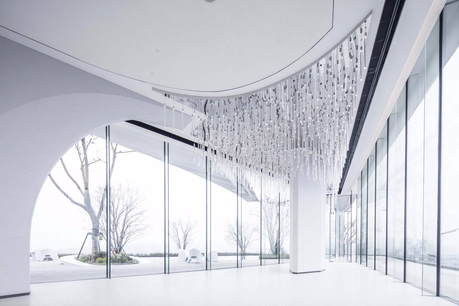 有限的設(shè)計語言被放大為懸崖、江灣、夕陽、和山形的運(yùn)用:建筑的整體形態(tài)復(fù)印江灣和山體的走向,用一條簡潔的曲線,塑造空中一道灣流。三角形的邊角地塊也因為一條弧形的切割,而表現(xiàn)出明確的方向性。