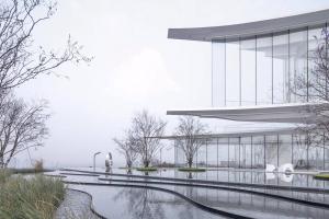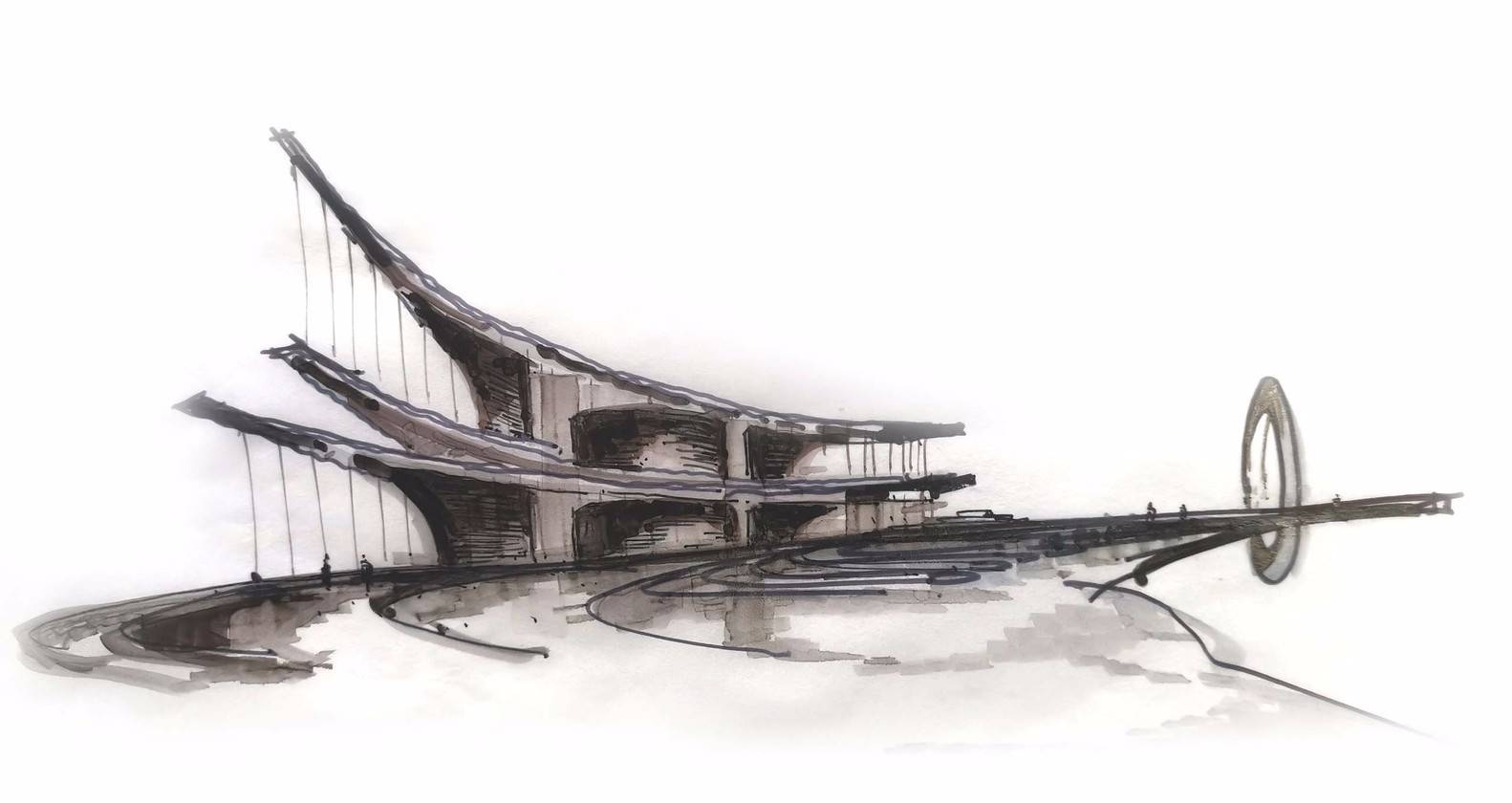 藝術(shù)館臨近嘉陵江畔,兩條反向的江灣左右了附近的城市肌理,形成城市區(qū)域內(nèi)宏大的自然背景,而選址恰好在臨江懸崖的制高點(diǎn)之上,能夠?qū)⒄麄€江灣的景色納入眼底,也可以俯瞰悅來未來核心TOD區(qū)域。