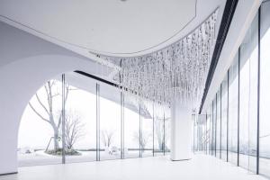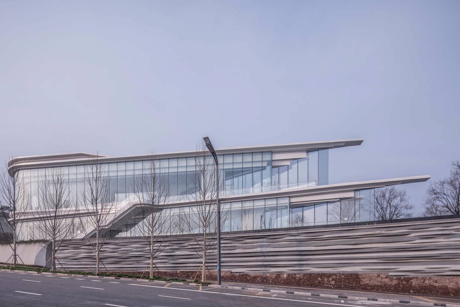 山體進(jìn)行了切割,令建筑能夠嵌入懸崖巖石之中,讓建筑最大程度上融入周邊環(huán)境。建筑本身摒棄了所有主觀的建筑符號,利用玻璃打造一個360度全通透的主體。夕陽西下之時,建筑能夠消隱在自然環(huán)境里,陽光甚至可以穿越整個藝術(shù)館照耀到后方的建筑上。