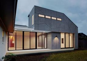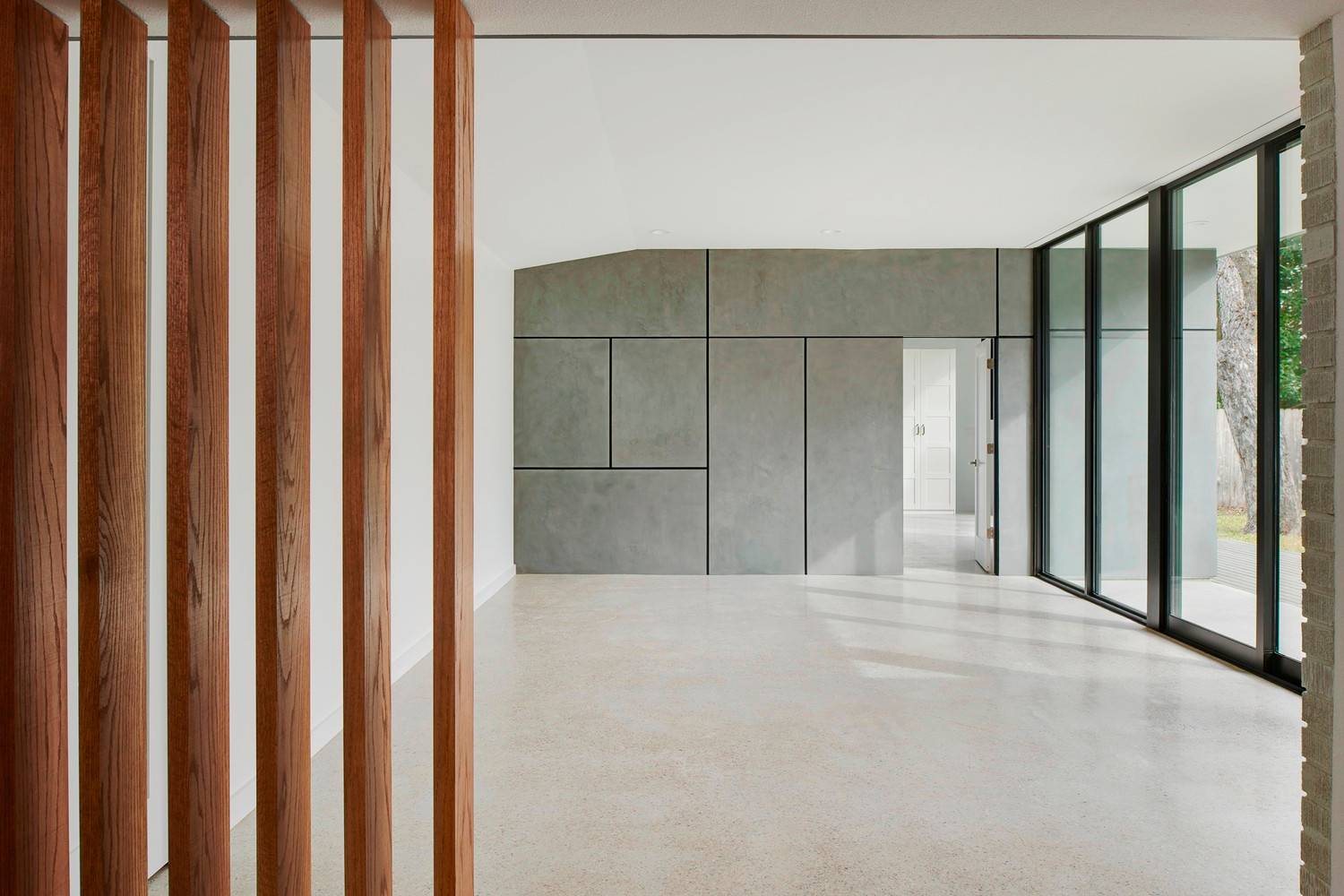 建筑物的染色灰泥表皮是由傾斜的伸縮縫組成。這些角度被帶斜切的外部甲板,以避免干擾相鄰山核桃樹的臨界根區(qū)。既有住宅和工作室的外部材料都被折疊到書房中,在新與舊之間產(chǎn)生對話,增強了與外部的聯(lián)系。