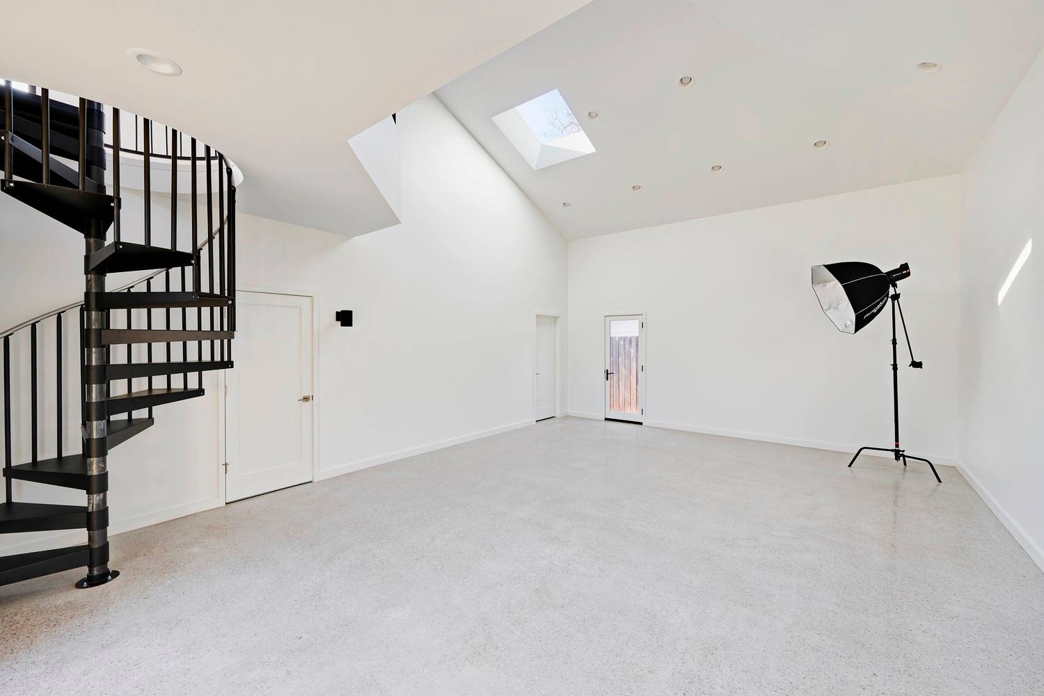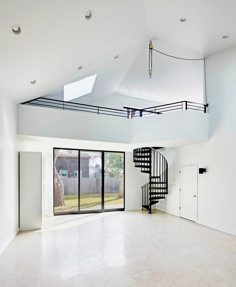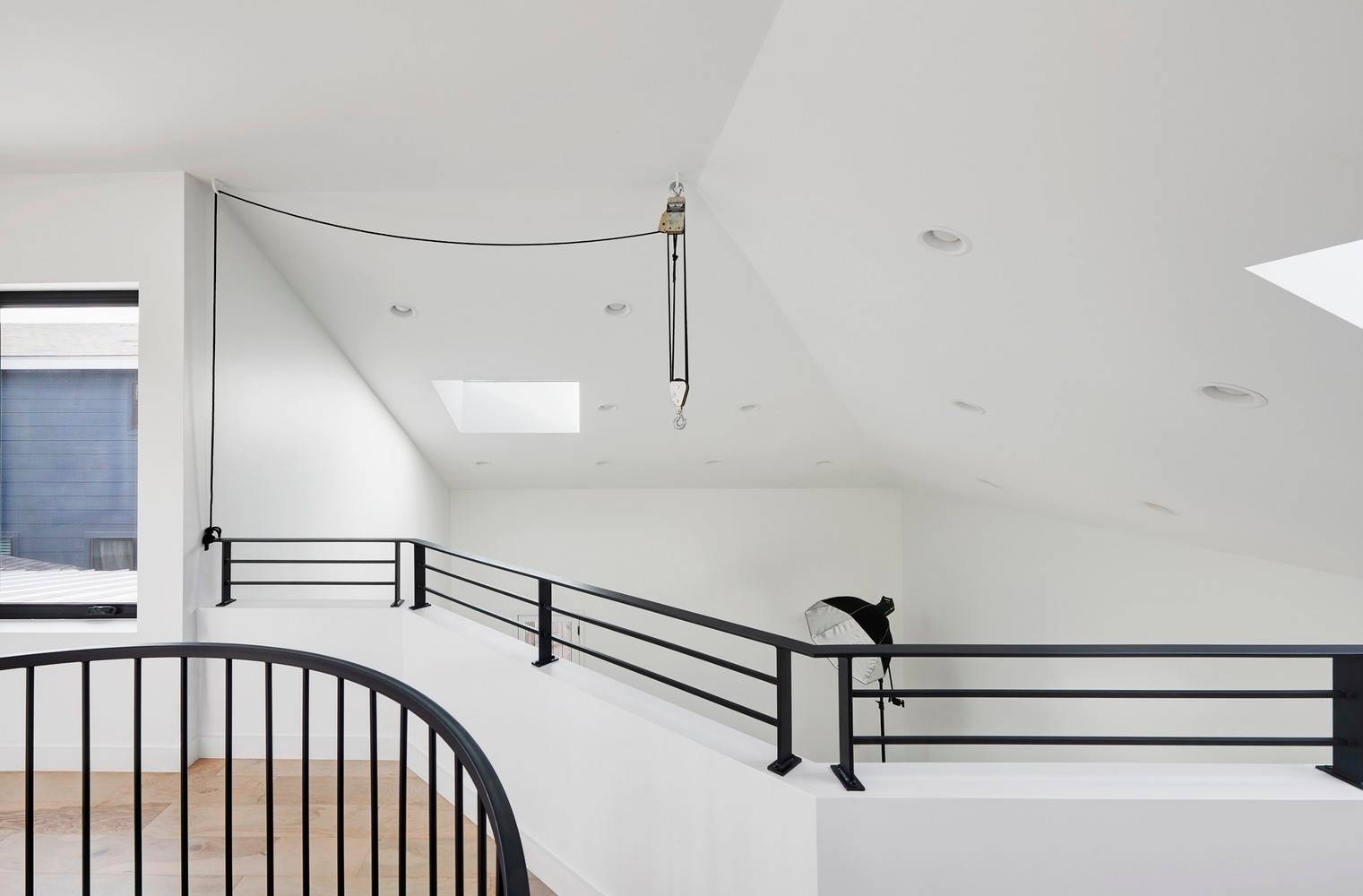 在灰泥墻后面,一個寬敞的工作室為藝術家提供了像瑞士軍刀般的實用功能:用于照明和背景的高天花板、用于提升重物的升降機、用于夾緊設備的金屬欄桿等。意想不到的空間通過位于天窗和一個嵌入式固定裝置與光線一起發(fā)揮作用。即使是鉸接式夾層也源于功能主義的需要 ——后退以允許最大的雙高度空間,同時保證進入的舒適。