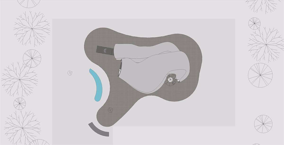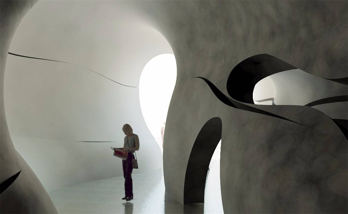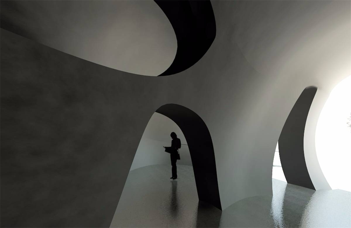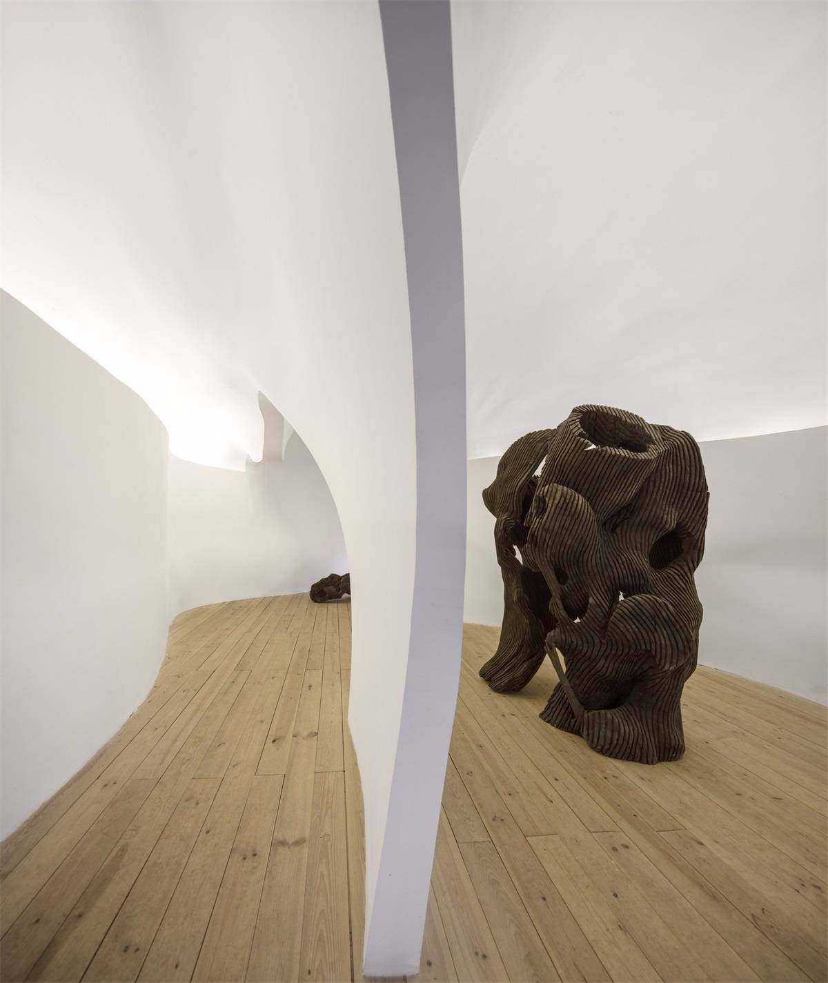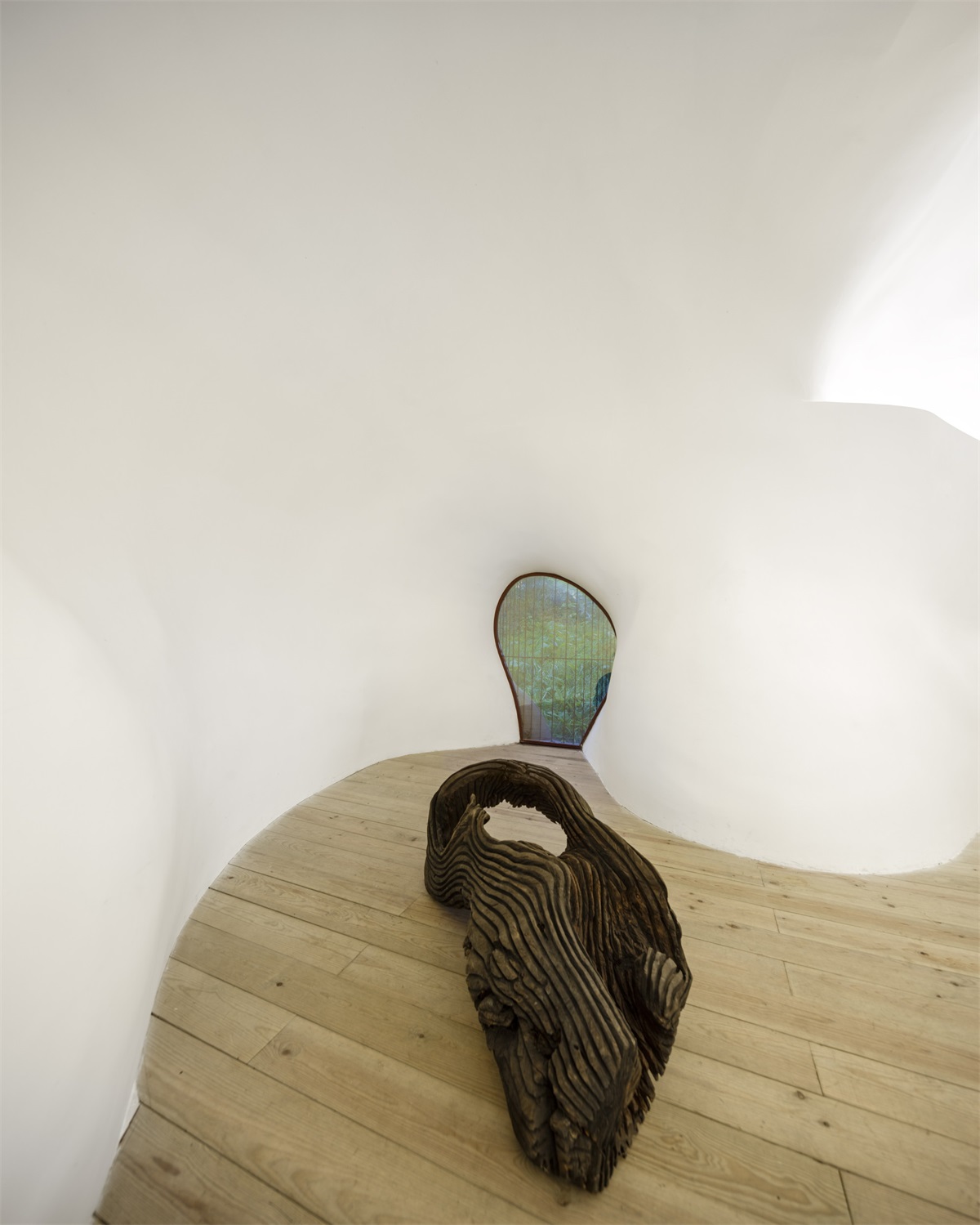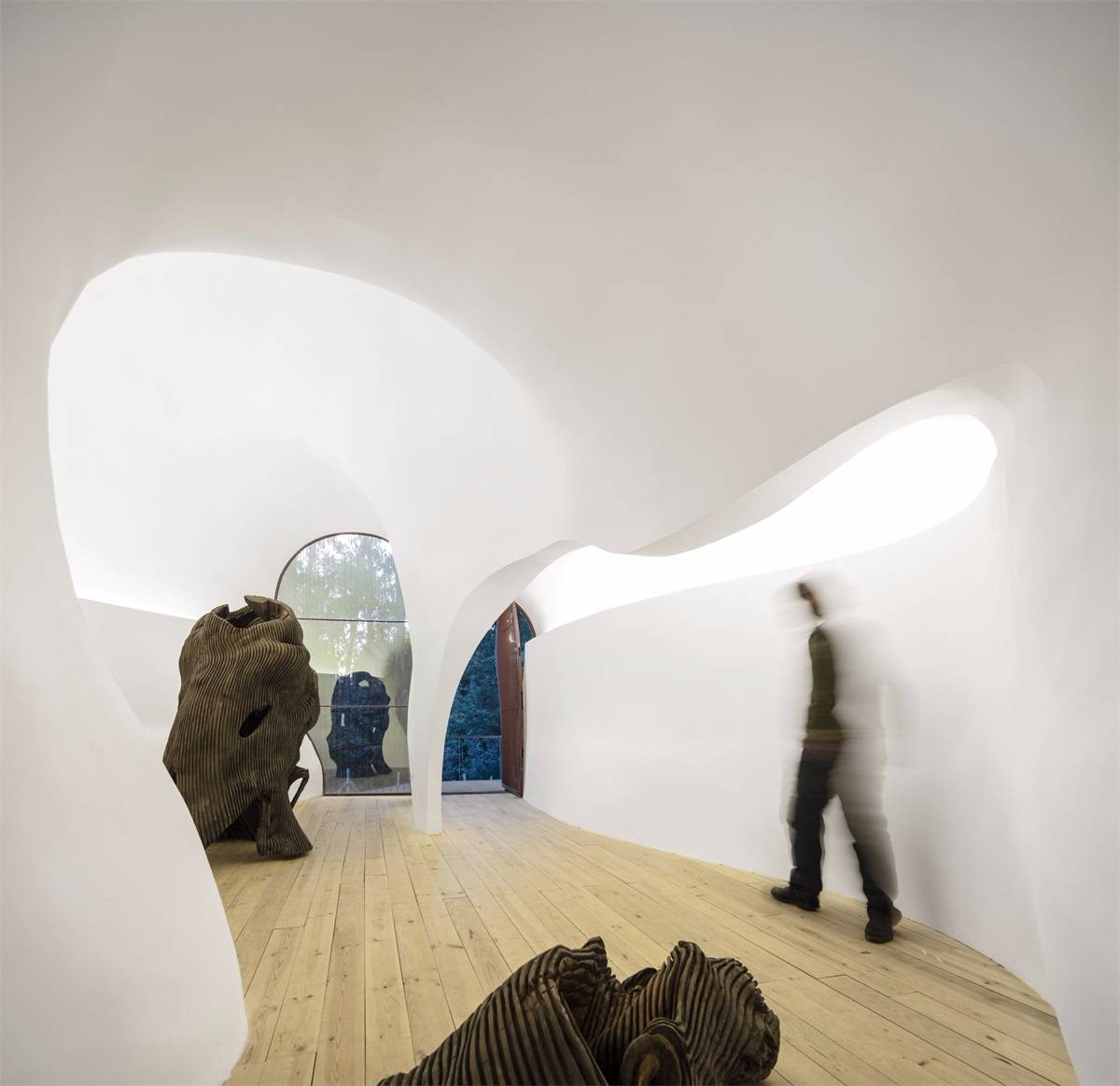 空間內(nèi)部鋪以木地板,原場地內(nèi)的樹木被部分移除。在室內(nèi),整個空間都涂上了石膏,從而提供了一個連續(xù)的表面。彎曲的形態(tài)為空間展覽作品創(chuàng)造了條件。