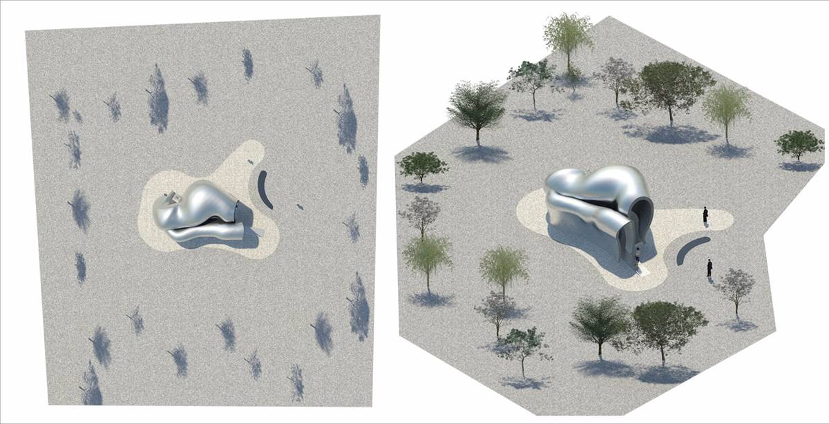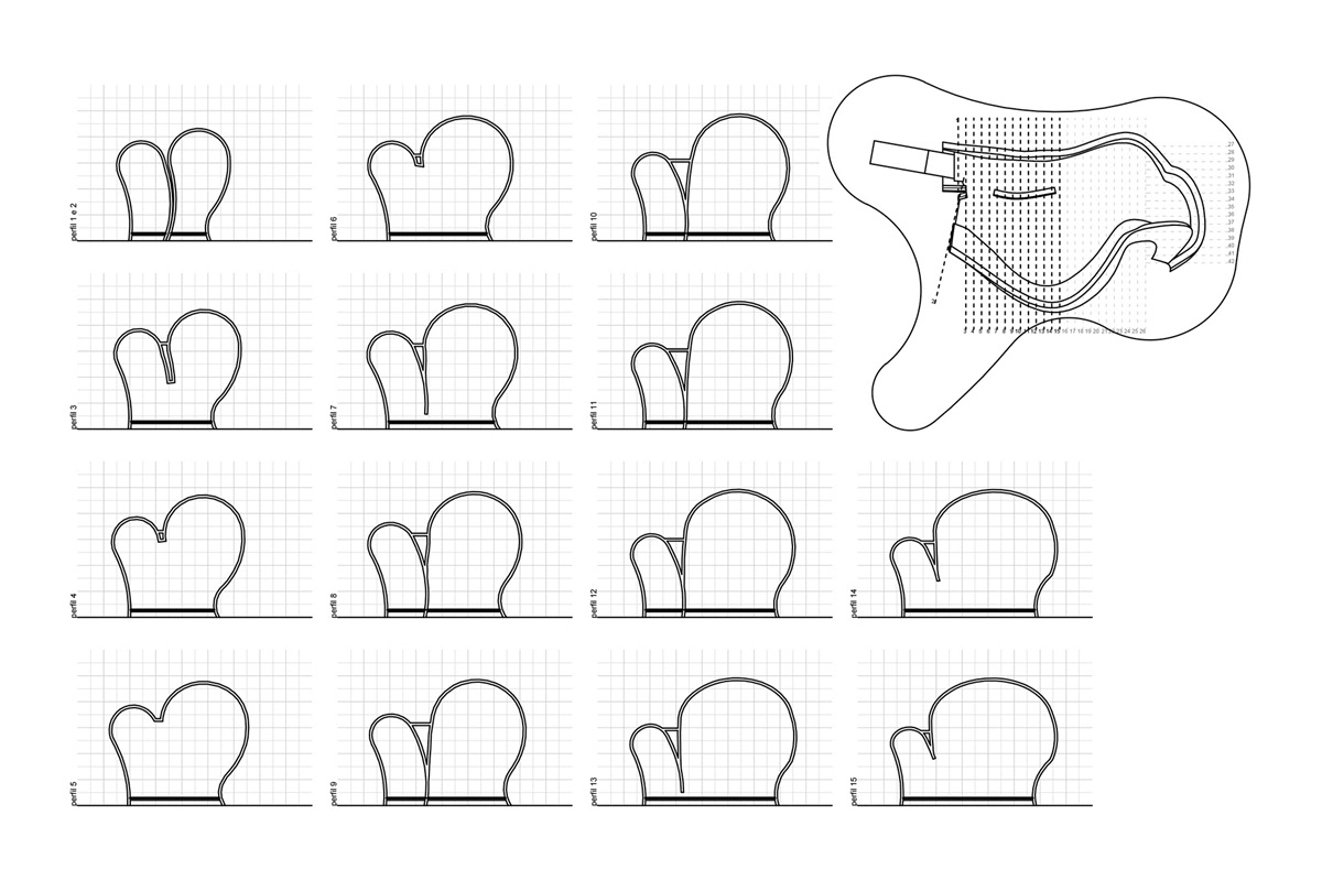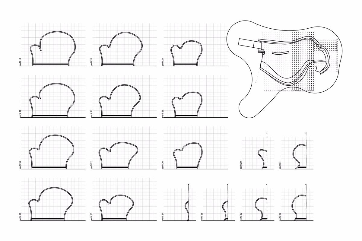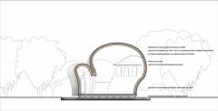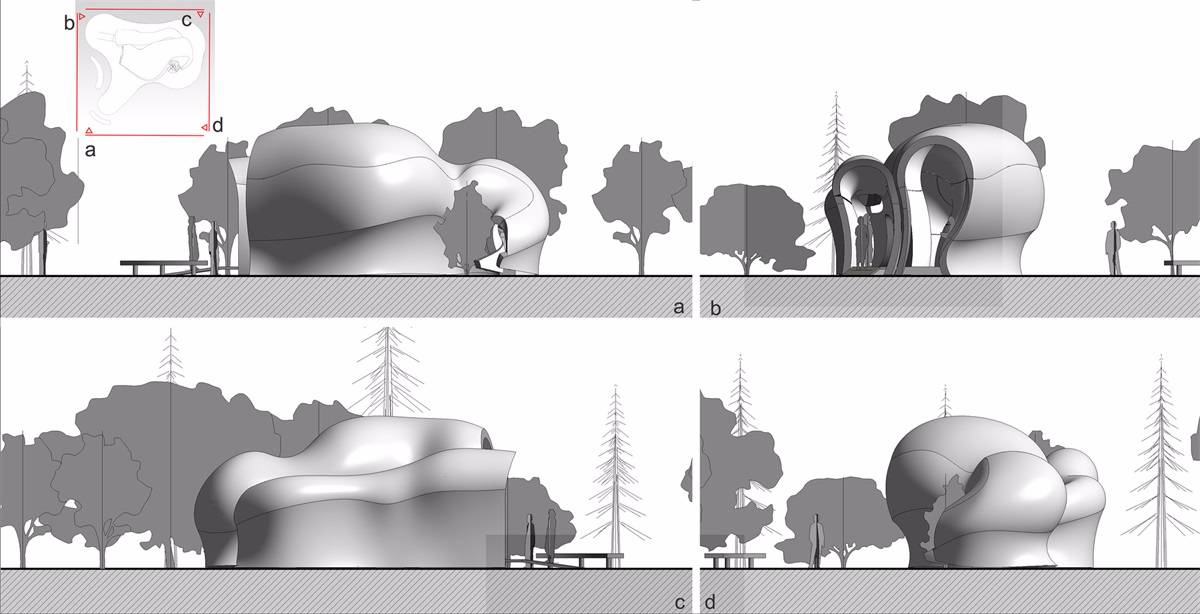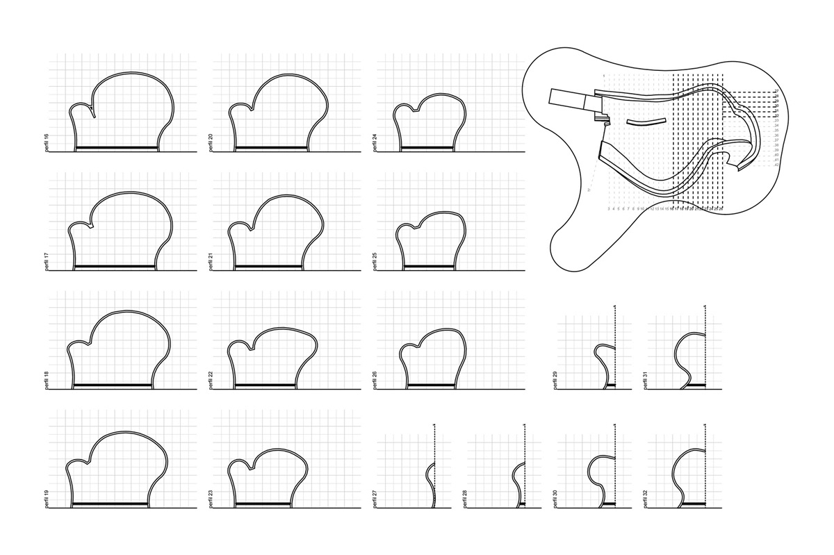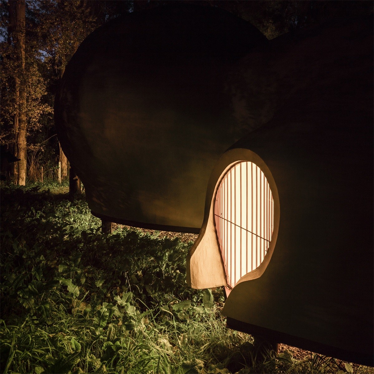 空間內(nèi)部鋪以木地板,原場地內(nèi)的樹木被部分移除。在室內(nèi),整個空間都涂上了石膏,從而提供了一個連續(xù)的表面。彎曲的形態(tài)為空間展覽作品創(chuàng)造了條件。