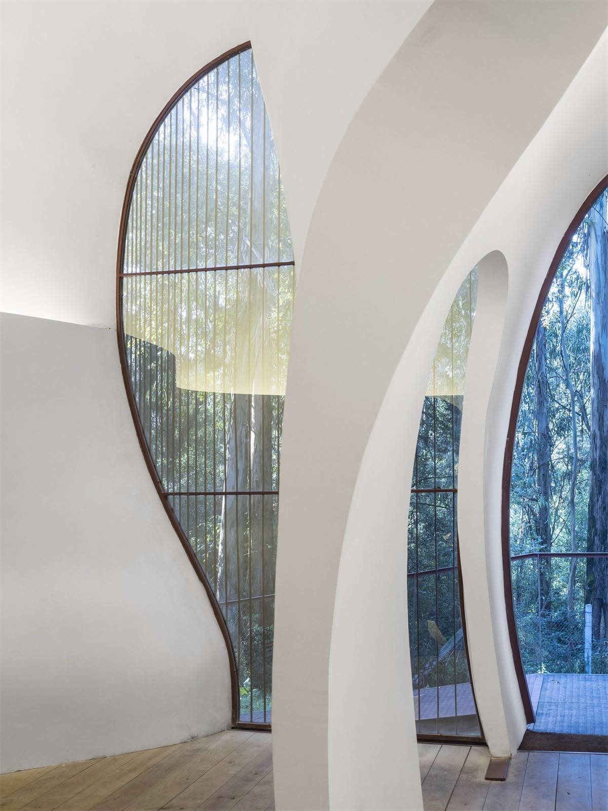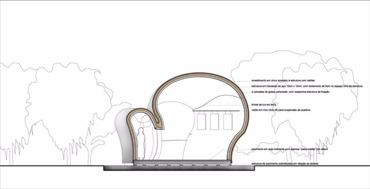 室內(nèi)面積十分局限,多位國內(nèi)外知名的藝術(shù)家在此舉辦過臨時展覽。幾乎所有部件都被輕輕地安裝于特定的節(jié)點處,仿佛懸浮于地表之上。管狀金屬結(jié)構(gòu)采用聚氨酯的外觀,仿佛一個殼一般,使建筑具有絕緣、防水的功能。