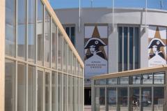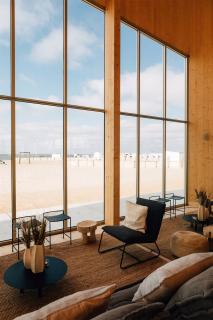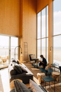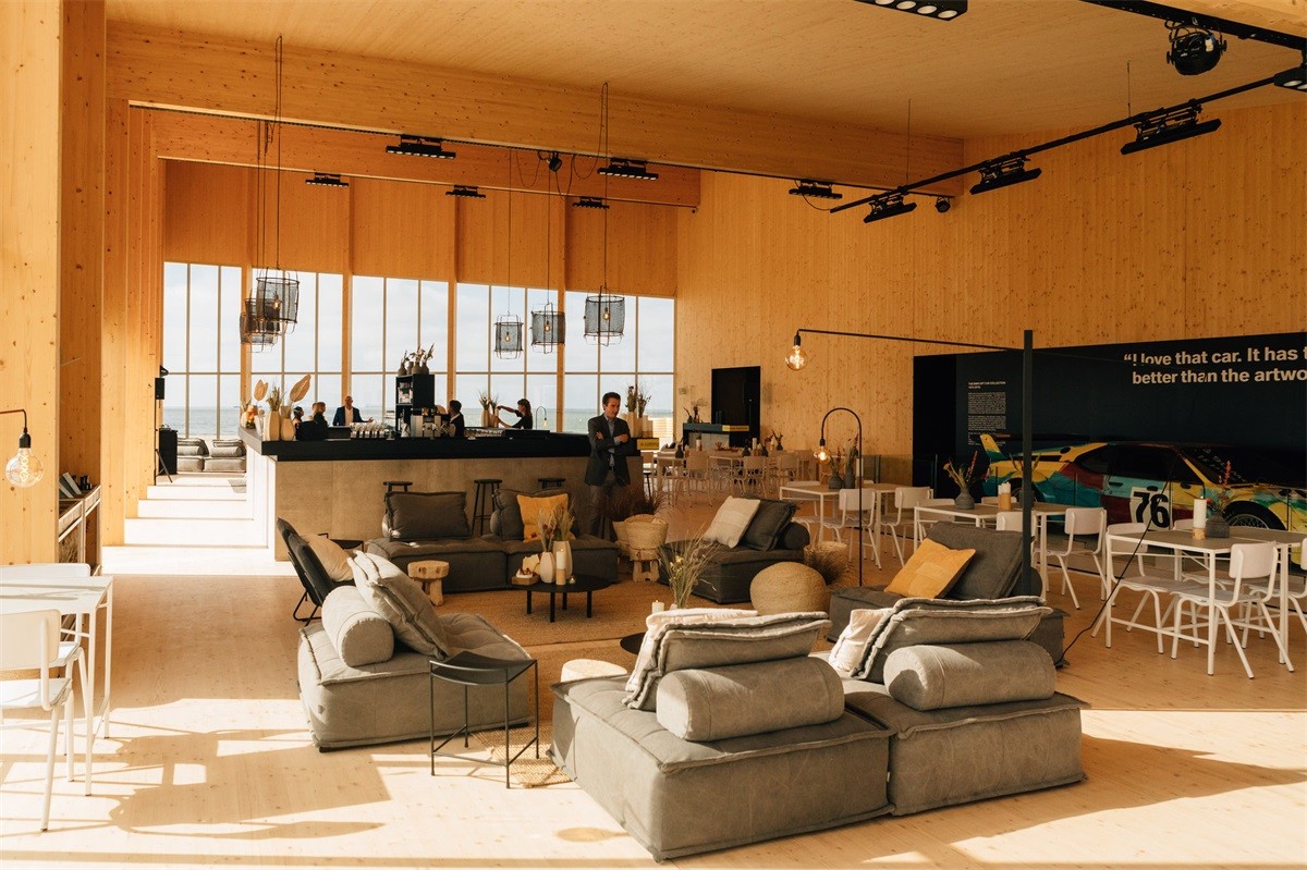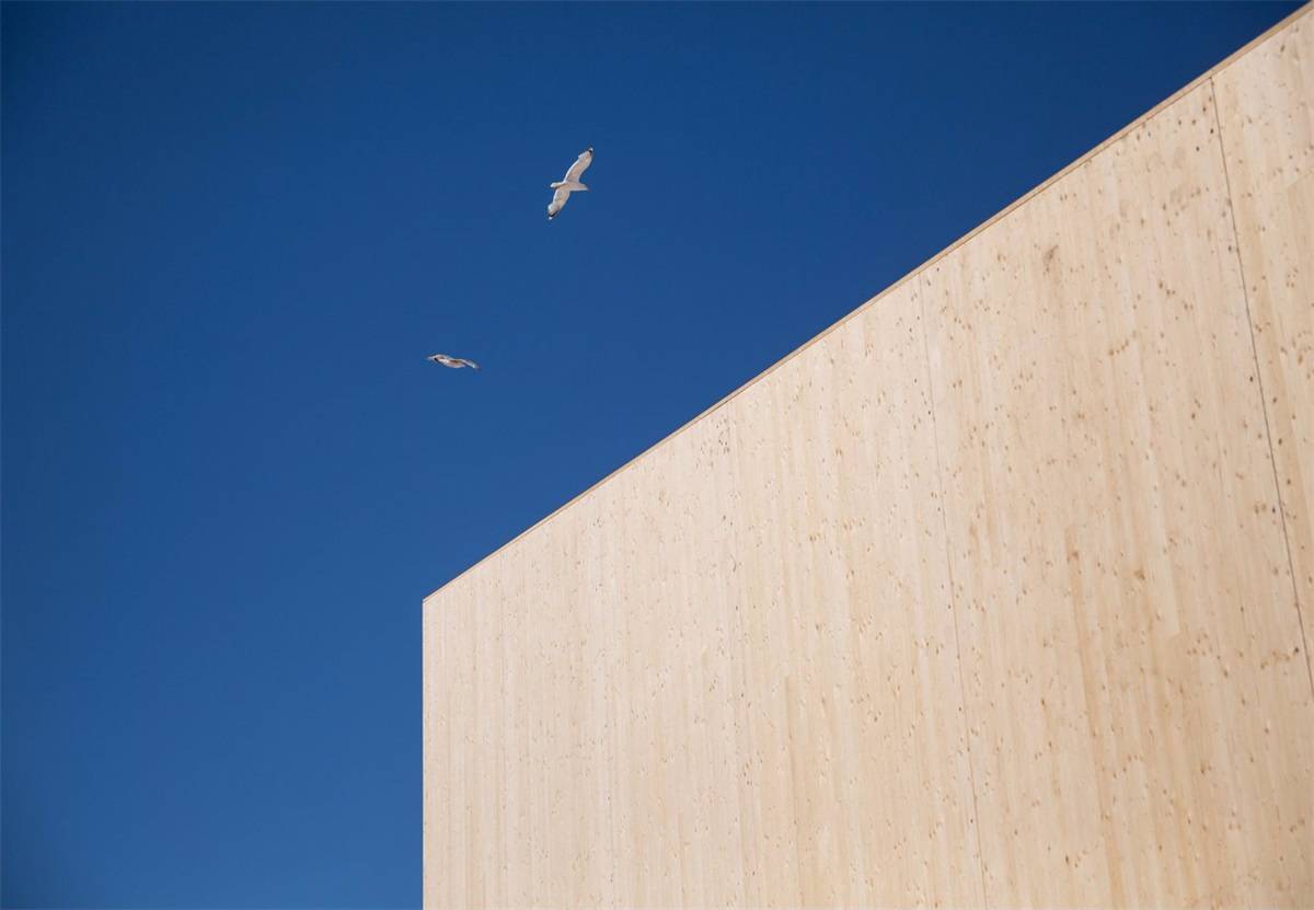 展館作為抽象的沙丘獨立出現(xiàn)在場地上,創(chuàng)造了一個中央入口的廣場。木結(jié)構(gòu)和藝術(shù)相互溝通,與環(huán)境,但被視為一個連貫的一塊。這導致了自然和人類造物之間的特殊相遇。長廊和海濱立面相互補充,提供啟發(fā)性的觀點和視角,增強了場地的吸引力。庭院作為一個生動的廣場展開,各種活動圍繞著它組織起來。此外,這里還能看到北海獨特的景色。