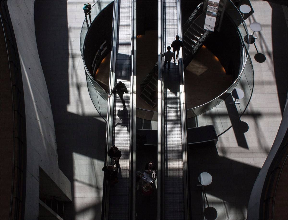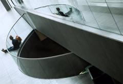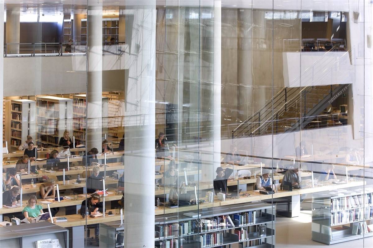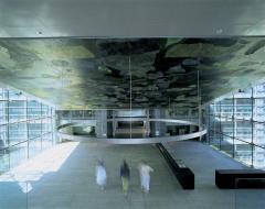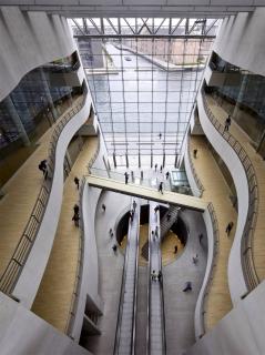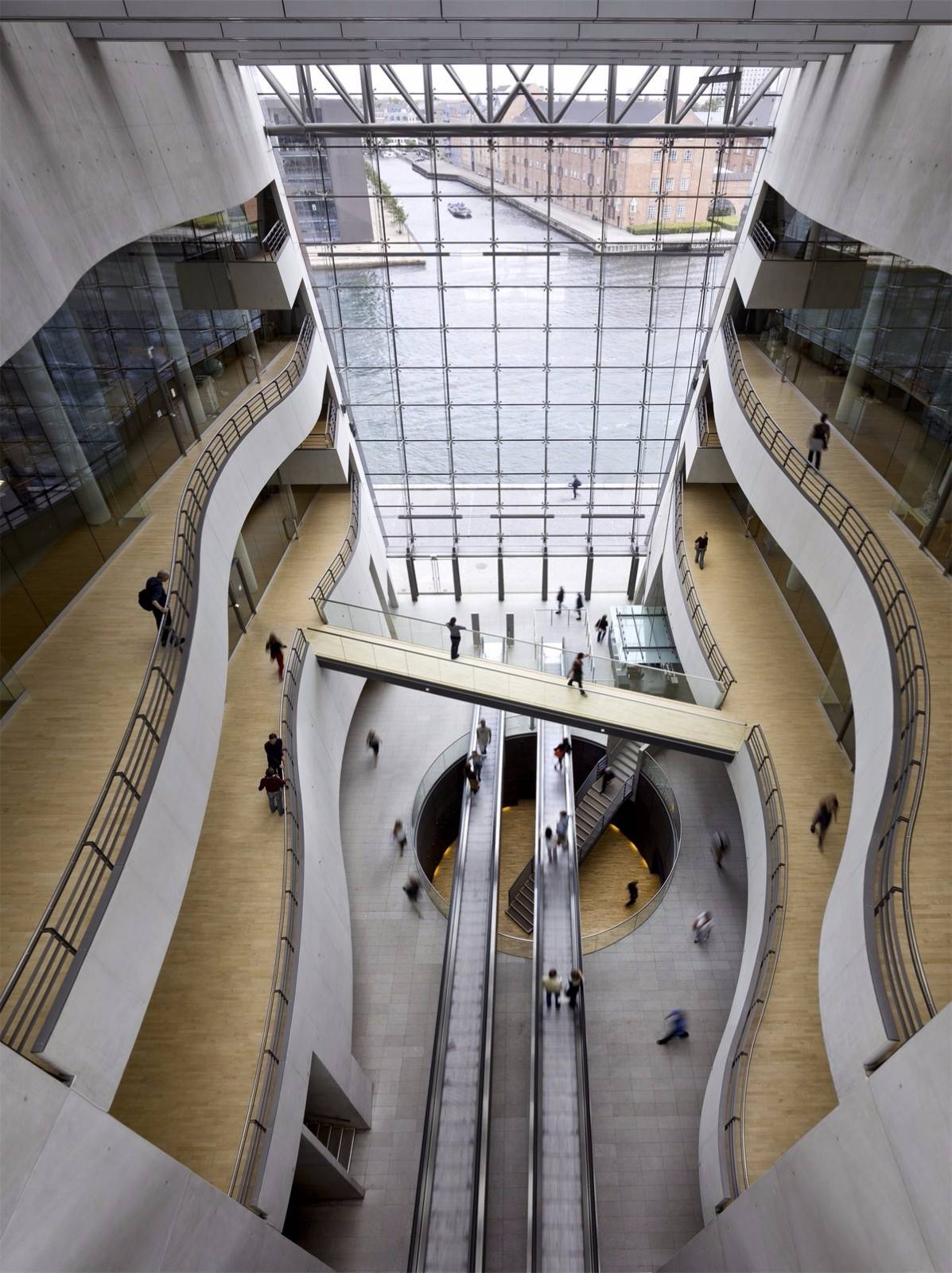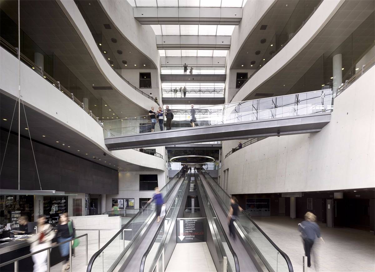 新圖書館有七層和一個(gè)地下室。實(shí)心的黑色立方體被一個(gè)巨大的玻璃中庭一分為二,中庭容納了大部分公共功能。這個(gè)中心空間,可以欣賞濱水的全景,也作為一個(gè)重要的日光來源,分散到整個(gè)建筑中。