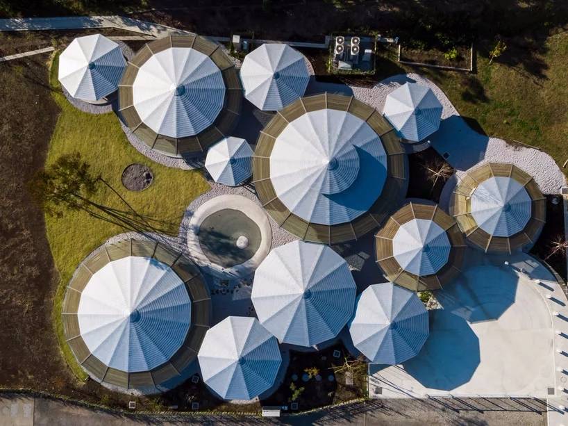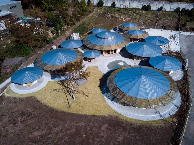 總部設(shè)在東京的手塚貴晴工作室日前在日本富士市新設(shè)計(jì)完成了“木庫幼兒園”,該幼兒園在2018年世界建筑節(jié)中的“已竣工學(xué)校建筑”類目中獲得一等獎。整個項(xiàng)目由一系列圓形的木結(jié)構(gòu)建筑組成,共同圍合出幼兒園的各個功能空間。