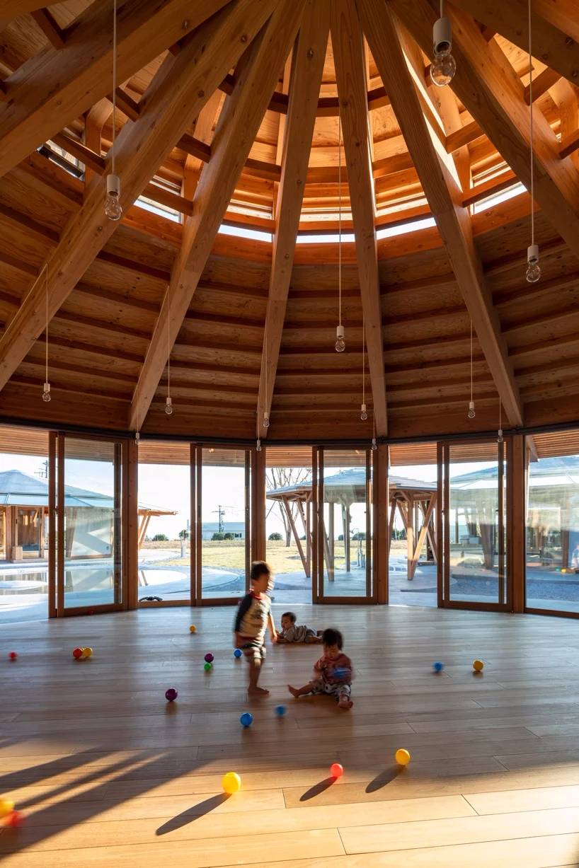 整座幼兒園均為單層體量,且室內(nèi)外均采用木材進(jìn)行建造,內(nèi)外統(tǒng)一,簡潔明了。木材的使用也給房間營造出一種暖意、溫馨的氣氛。屋架的建造是為了在外部形成大懸挑,創(chuàng)造遮蔽風(fēng)雨和遮陽納涼的半室外空間。支撐屋頂?shù)哪局苋菀鬃屓讼肫鸪善臉淠竞头泵臉涔???偟膩碚f,手塚貴晴工作室構(gòu)思的圓形方案充分考慮了如何讓兒童在發(fā)育階段從幼兒園空間中接收最多的益處,站在這個出發(fā)點(diǎn)上,他們最終設(shè)計(jì)出了這座“木庫幼兒園”。