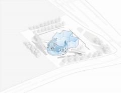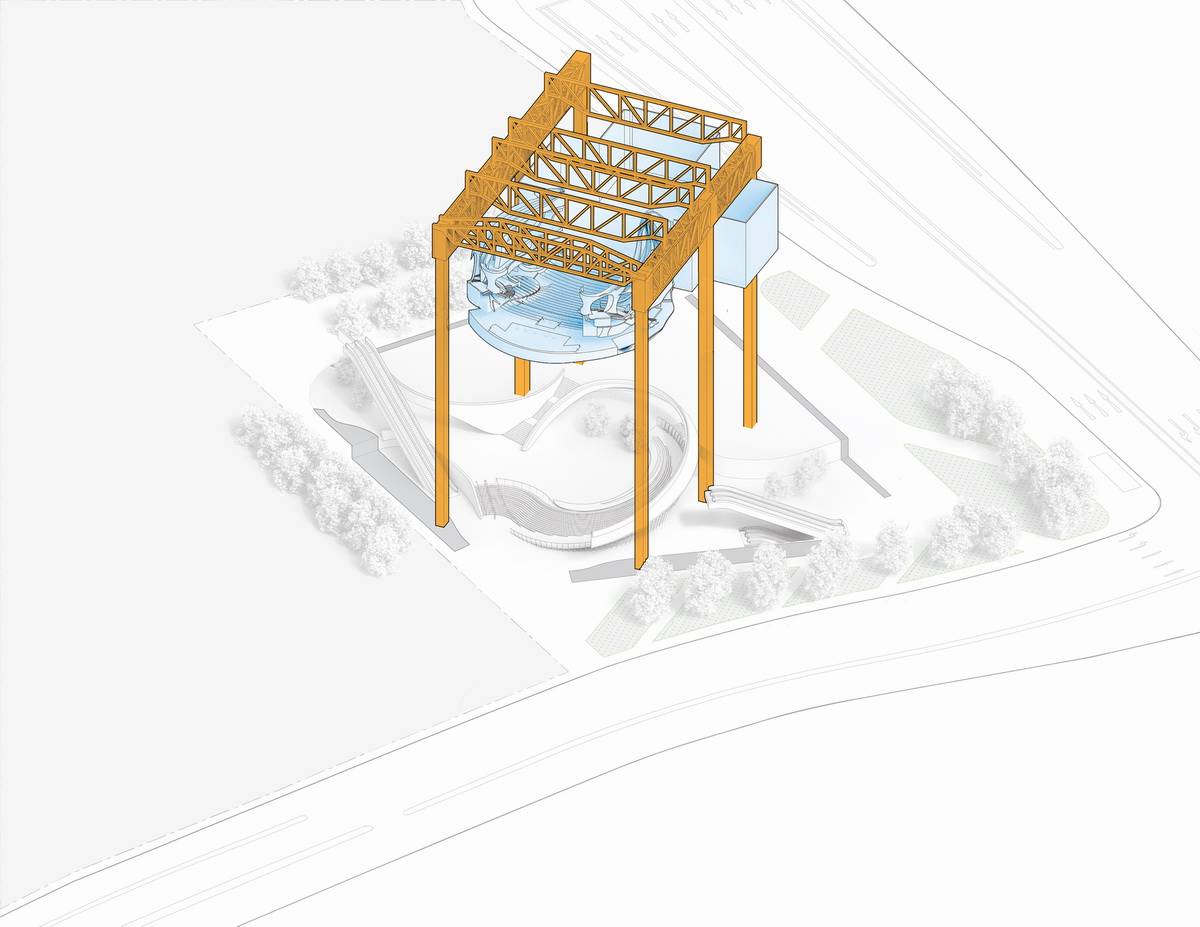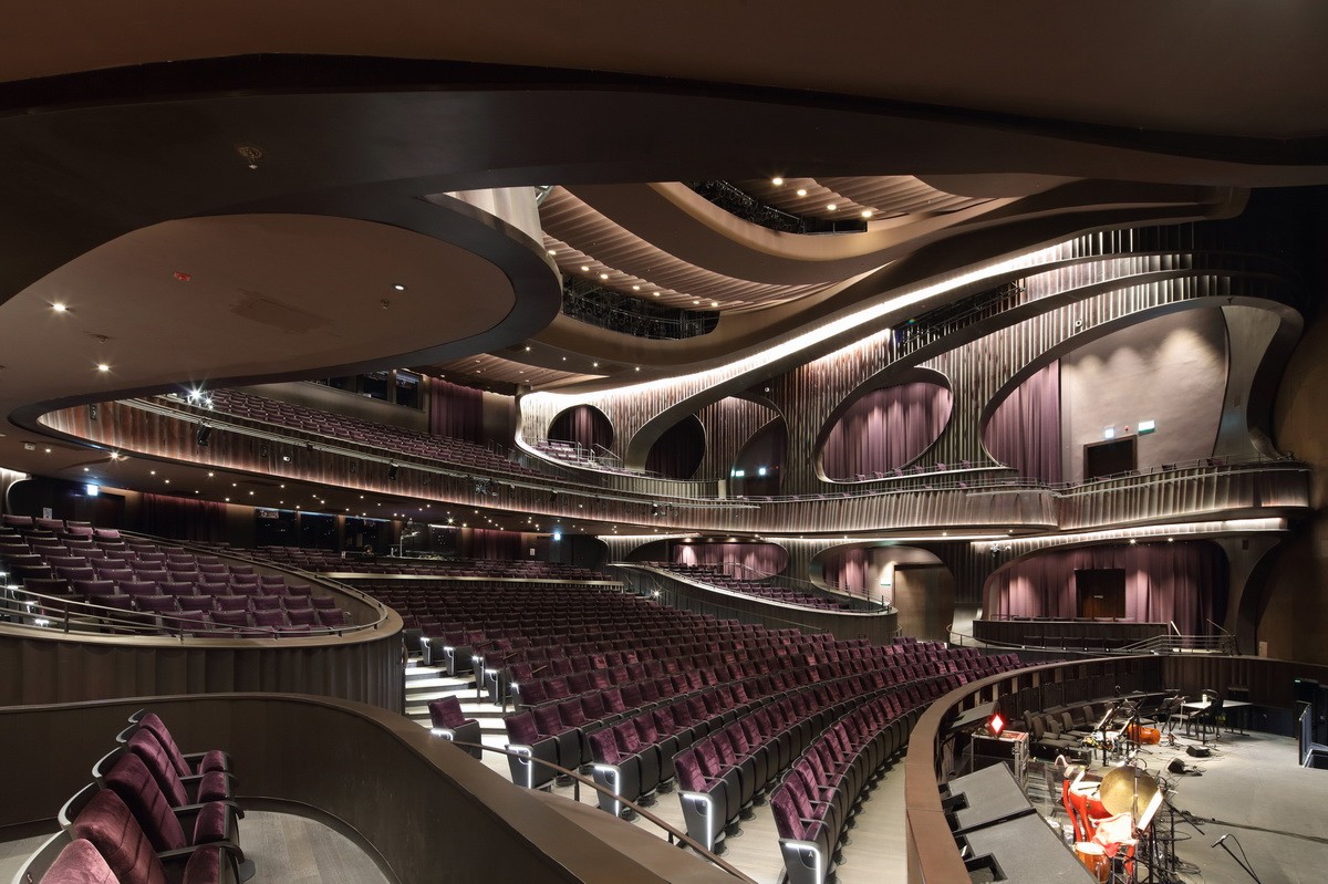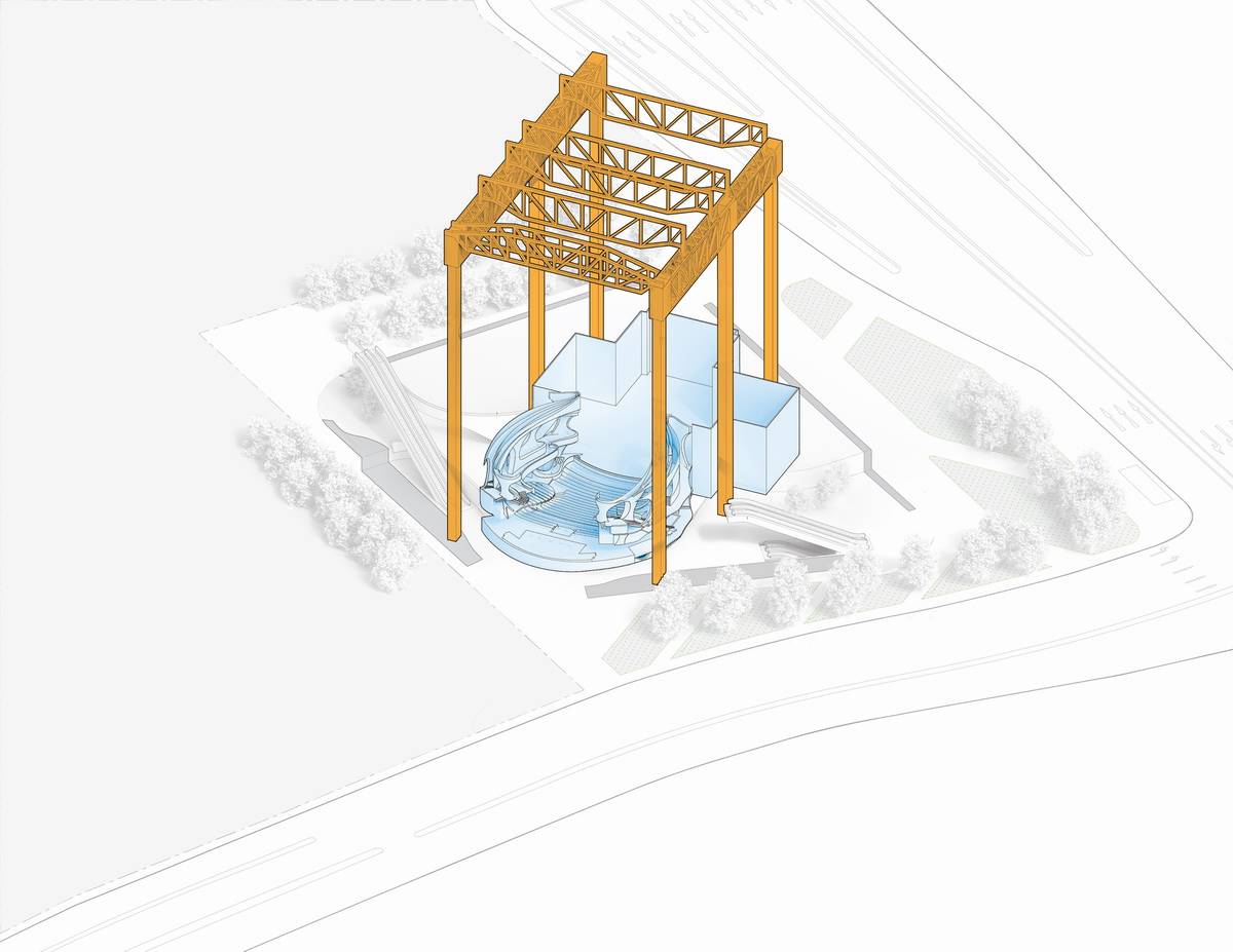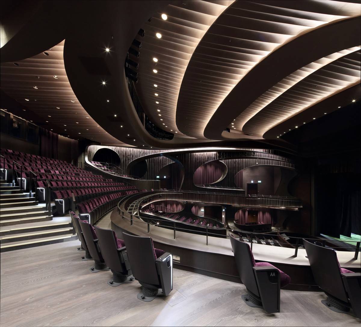 這種創(chuàng)新的設(shè)計(jì)使可容納1073個(gè)座位的大劇院安置于距離地面27米的建筑頂部,方便了中庭和公共廣場(chǎng)的內(nèi)部配置,同時(shí)戰(zhàn)略性地將禮堂與周圍城市基礎(chǔ)設(shè)施的振動(dòng)和高環(huán)境噪聲隔離。這一創(chuàng)造性的設(shè)計(jì)舉措非常有益,能夠使工人安全地在大劇院內(nèi)部和下方同時(shí)進(jìn)行建設(shè),從而縮短了施工時(shí)間。