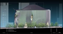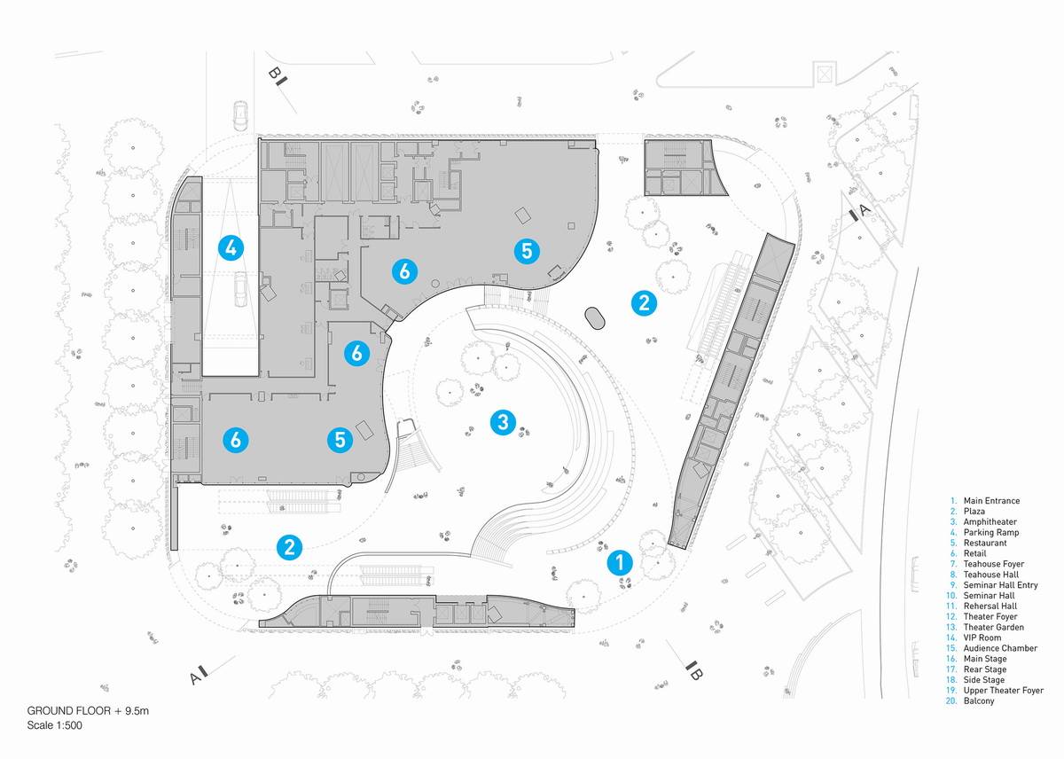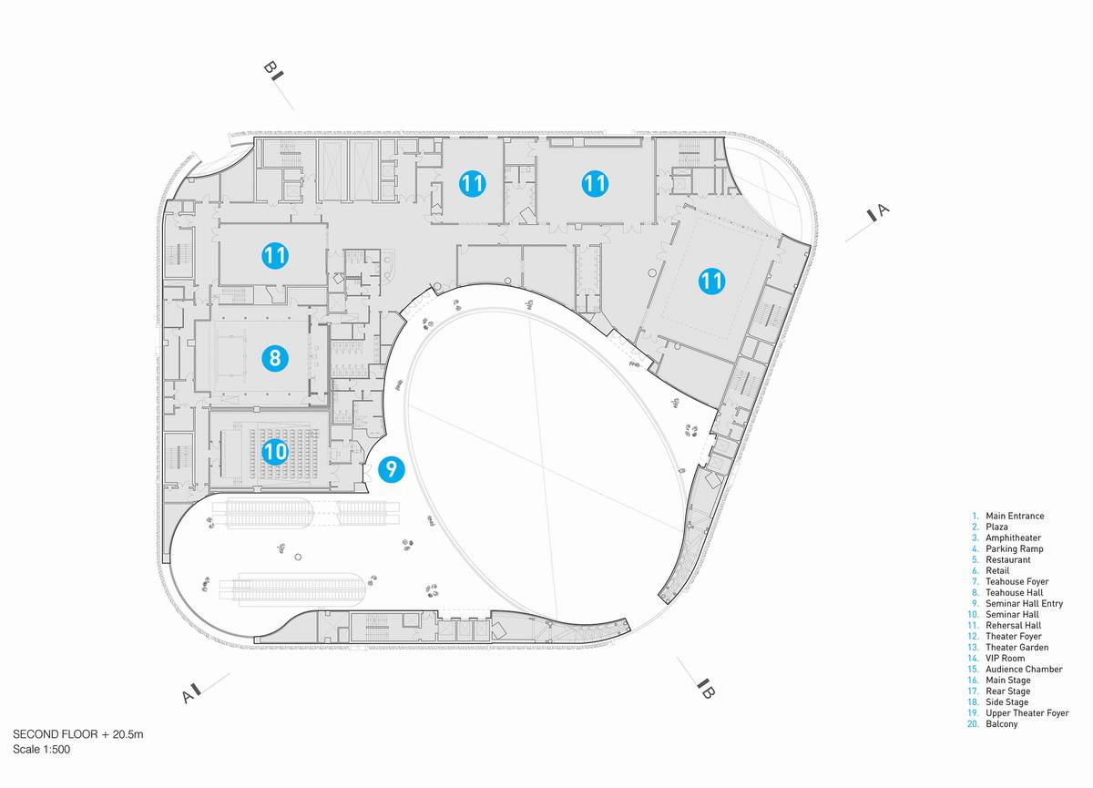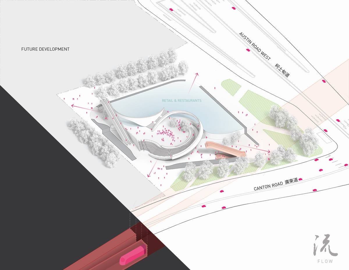 大劇院兩側(cè)是兩個(gè)戶外空中花園,游客能夠在此欣賞維多利亞港的全景,同時(shí)為下面的200個(gè)座位的茶室劇院、排練室、教育和行政空間、演講室和零售區(qū)創(chuàng)造了空間,可以俯瞰自然通風(fēng)的內(nèi)庭院。