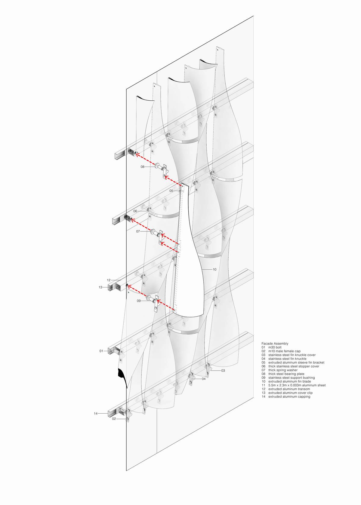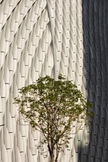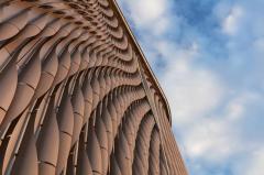 戲曲中心活躍的立面由一個(gè)模塊化的鰭片系統(tǒng)組成,由未經(jīng)處理的航海級(jí)鋁管切割而成,沿著建筑排列成交替的圖案,讓人想起舞臺(tái)上串珠幕布后閃爍的燈籠。