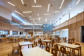 多媒體中心區(qū)域,各學年組都可以方便使用,學生們可以朗讀,聊天,網(wǎng)絡查閱資料,吃午餐。西側的推拉門在使用時可將門展開,將區(qū)域封閉,可防止噪音擴散,作為多功能開放大廳使用。