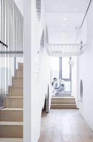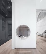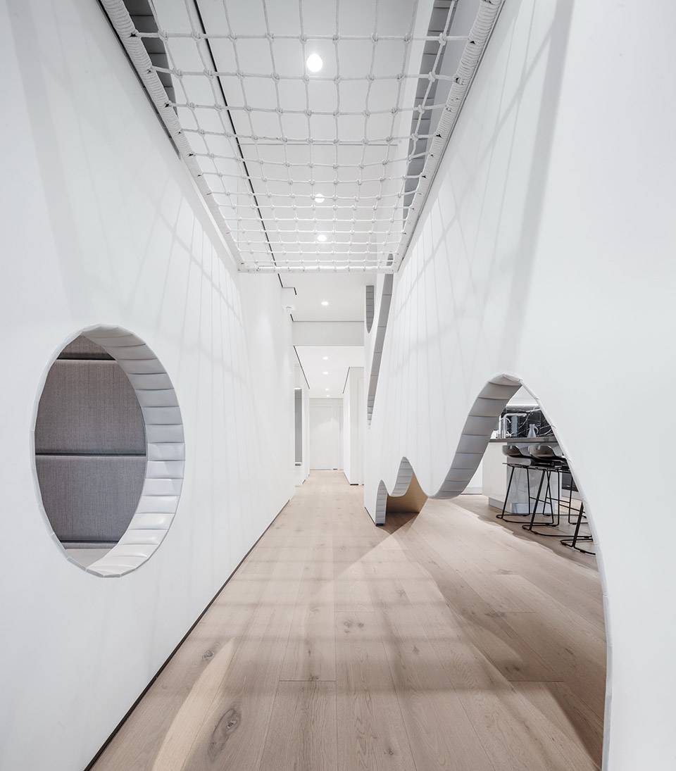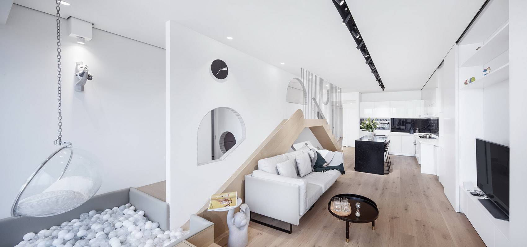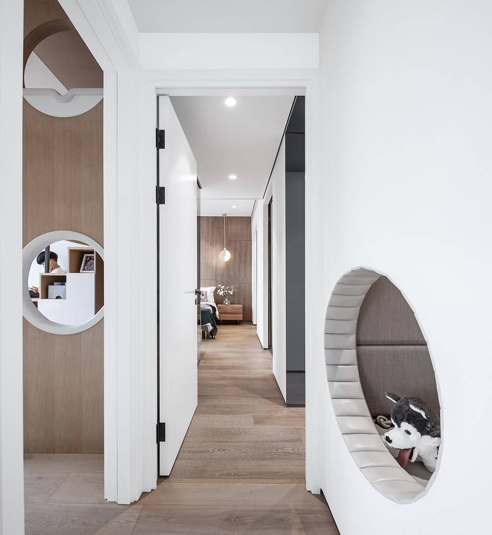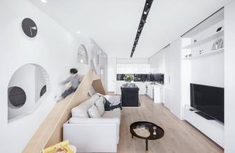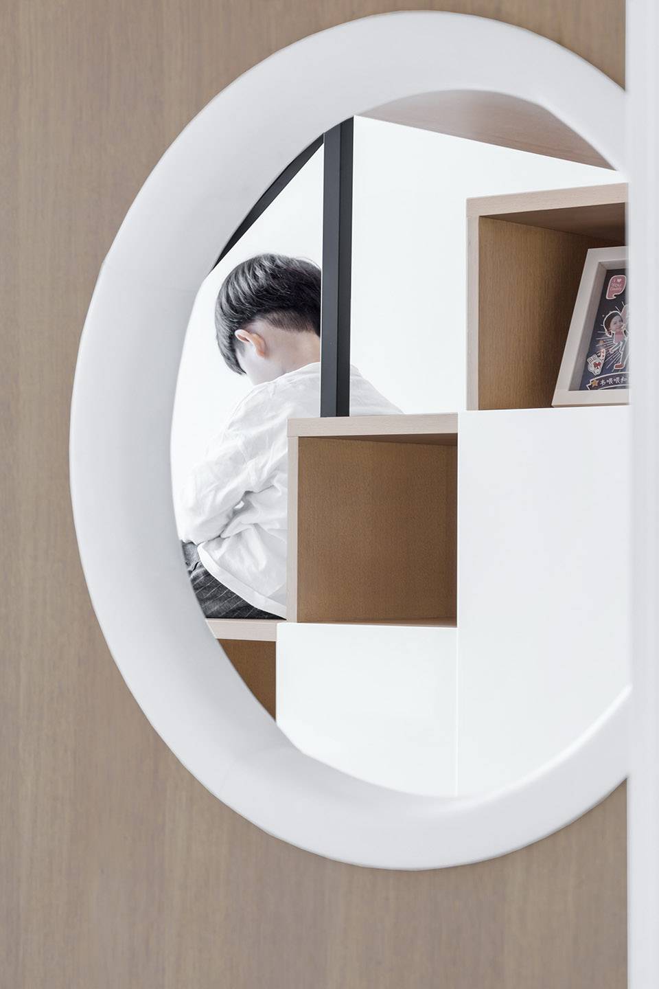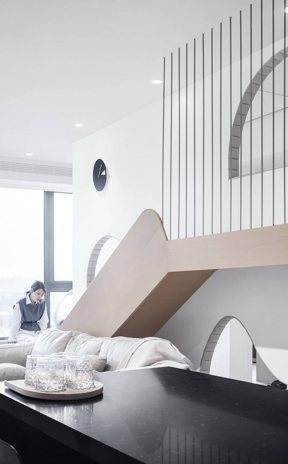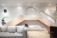 客廳側(cè)的【墻】上除了形態(tài)各異的洞口,還有一道集合了樓梯和滑梯的弧線,這也是設(shè)計(jì)特意引入的環(huán)繞式路徑:爬上樓梯、滑下滑梯、在海洋球池中嬉戲、從沙發(fā)后的洞口鉆出來或跑回樓梯再來一組運(yùn)動。