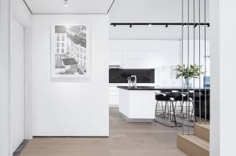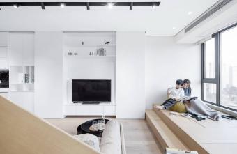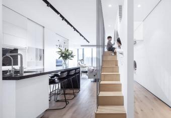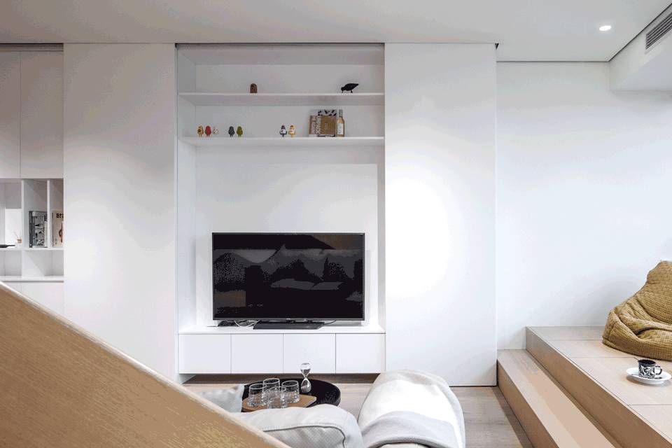 客廳及廚房空間:一片6米長的【墻】作為客廳中的一座“山”,圍繞著“山”形成一系列活動