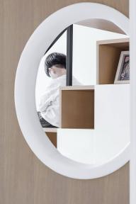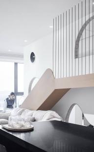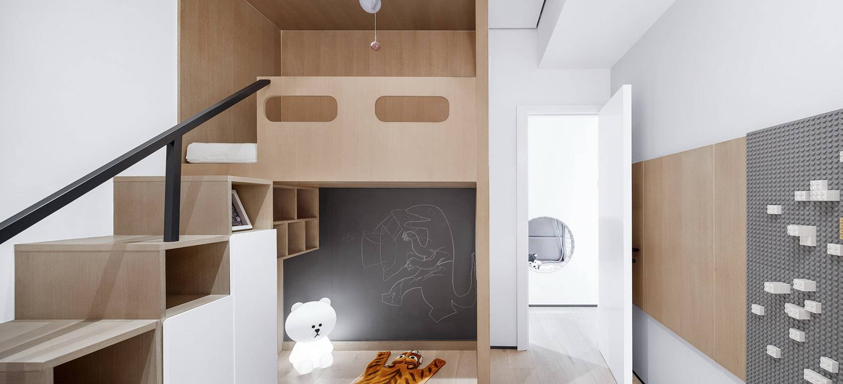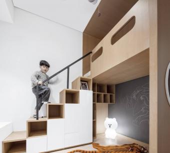 如果說客廳的改造是整套公寓的“題眼”,解決之后,摧枯拉朽,一馬平川。那剩余每個房間的“小修小補(bǔ)”靠的則是設(shè)身處地的體貼和無微不至的細(xì)膩。比如,在不足5m2的兒童房里,一分為二,上寢下居,學(xué)習(xí)玩耍休息生活一應(yīng)俱全。