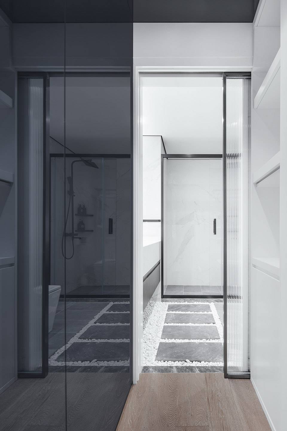 以業(yè)主小時候在漓江踩水的回憶為靈感,從桂林空運(yùn)來石板與鵝卵石鋪設(shè)在衛(wèi)生間里