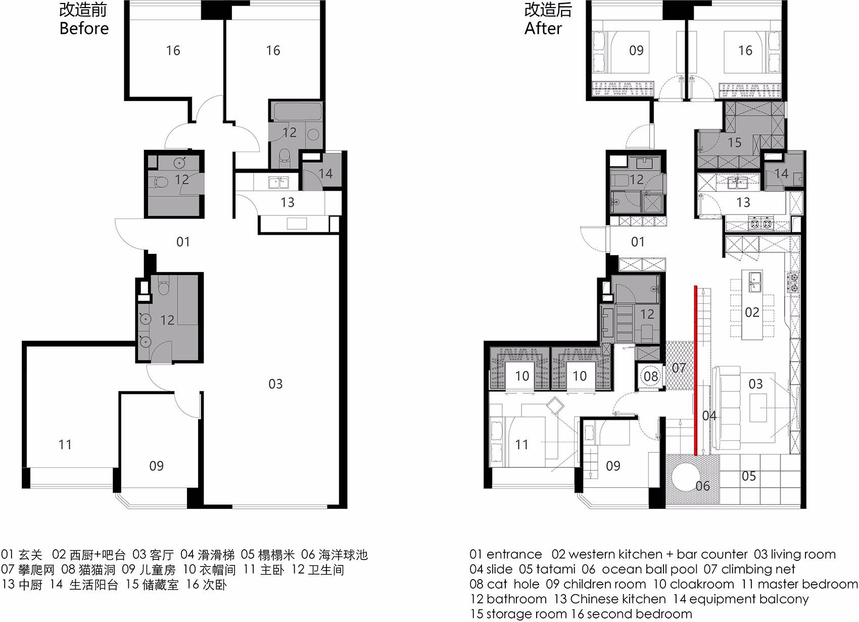【墻】雖有趣,但單一的路徑也難免使人疲倦,于是我們在墻上飛架起一座玻璃和繩網(wǎng)的橋。這就為爬上樓梯后的活動增加了可能:除了滑下滑梯,還能穿過廊橋,鉆過洞口,像人猿泰山般滑下纜繩,再躲進(jìn)貓貓洞里睡上一覺?!緣Α康膭幼鲾?cái)嗟牟粌H是尺度上的疏離,還有超大空間里隱私缺失的尷尬。吧臺、樓梯、臺階、滑梯、平臺、廊橋、樹洞、吊椅等等,這一系列微小日常的空間像是海綿里的空隙,容納著整個家庭活動的無限可能。當(dāng)游戲時,【墻】是道具 、是舞臺;當(dāng)安靜時,【墻】是懷抱、是港灣。