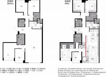 二胎夫婦、三代家庭。魔都新房、連線故鄉(xiāng)。房子的過去是一套四房一廳的精裝交付公寓,巨大的客廳是建筑設(shè)計(jì)詩意的留白,廳大而房小,無奈之下顯得冷清。業(yè)主韋謙和劉媛夫婦期望在這里能有兩個孩子自由活動的天地,更能有家鄉(xiāng)桂林的山水形神。