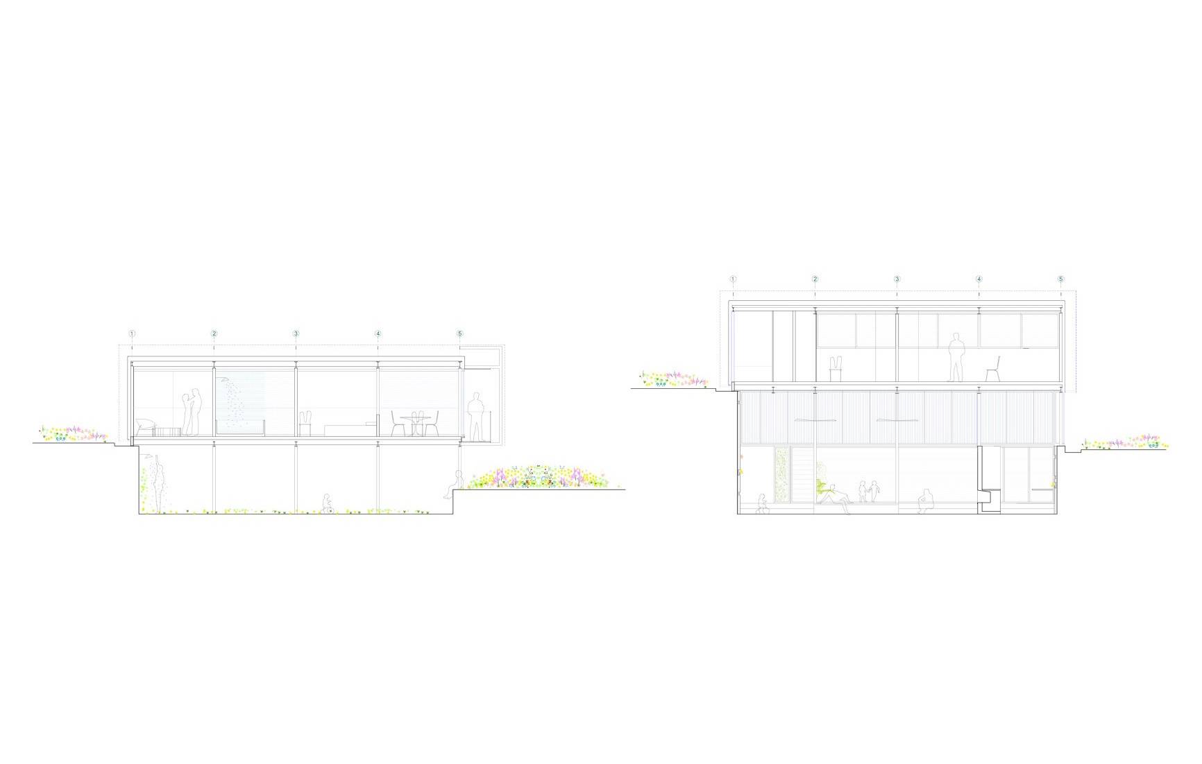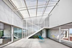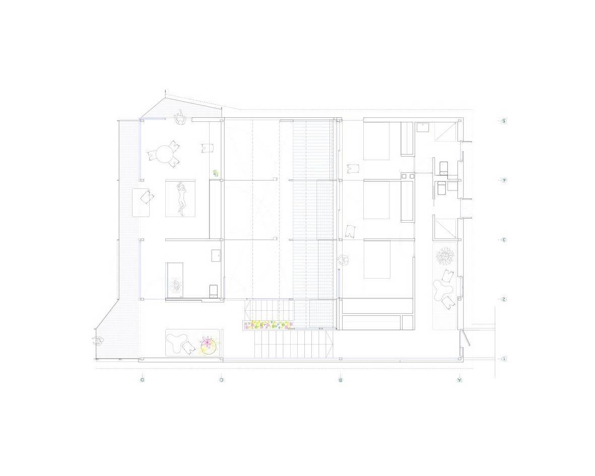 兩個(gè)不同高度的頂層覆蓋與最私密活動(dòng)連接的操場(chǎng)。現(xiàn)實(shí)超越了一個(gè)連續(xù)而無(wú)限的環(huán)境。 可以在樓上吃飯,在沙發(fā)上睡覺,或在后院閱讀,在建筑前淋浴。