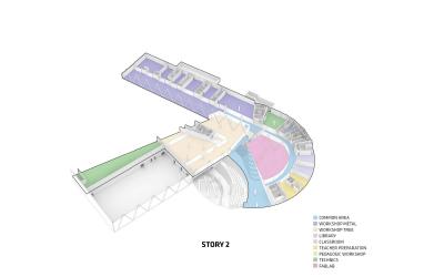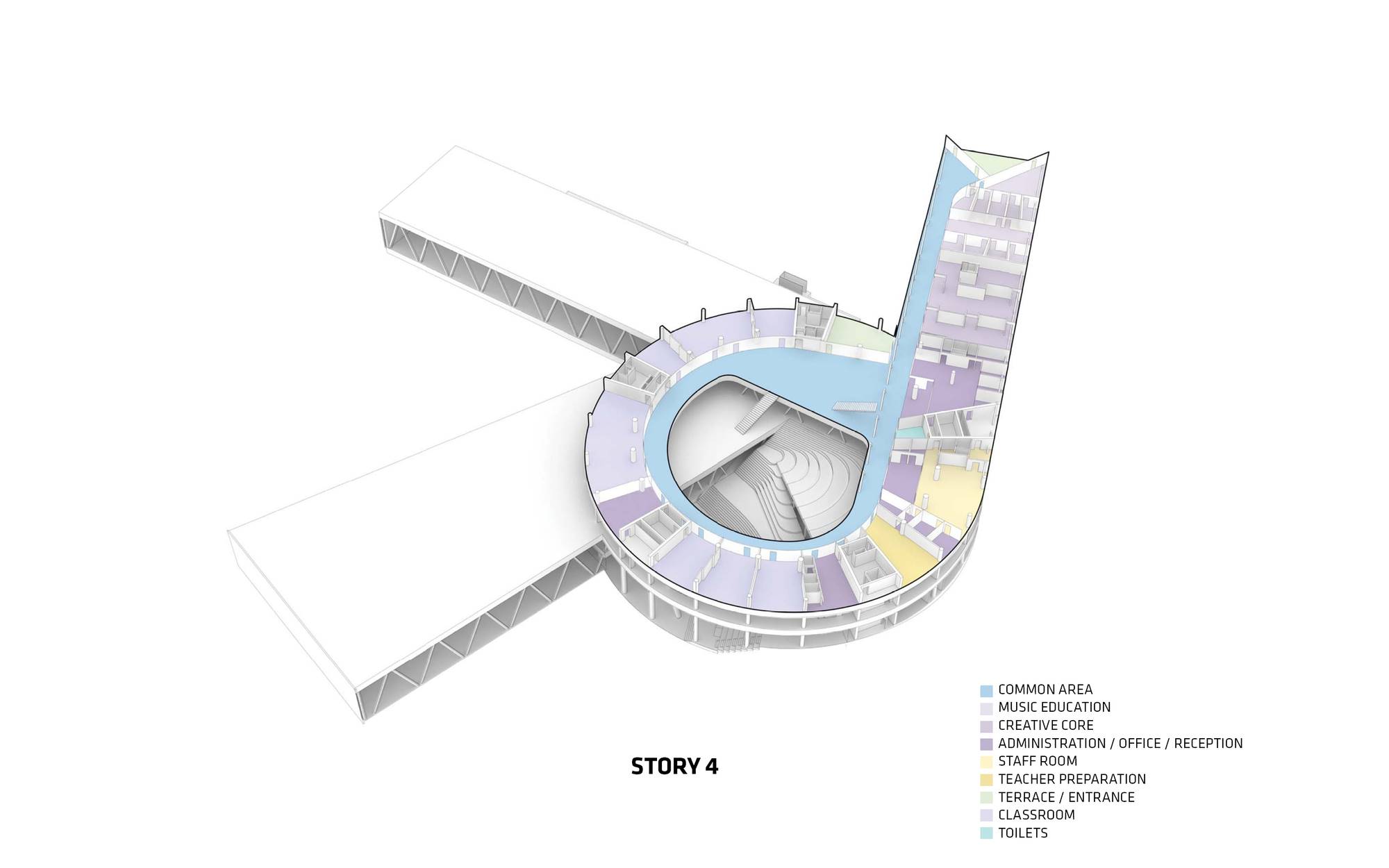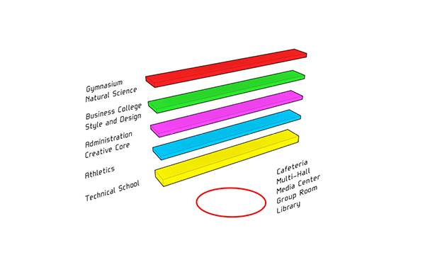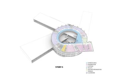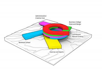 由于場地呈陡坡狀,學校的主入口可以從一座引人矚目的人行天橋進入。來到里面,學生和老師立即就能體會到圓形庭院的歡迎氣氛,它為所有樓層的學術(shù)興趣創(chuàng)建了一個自然的聚集點。