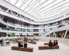 Glasir 保留了這三所學校各自的自主權(quán)和個性,同時為合作和開展教學活動創(chuàng)造了理想的條件 —— 這是一個創(chuàng)新孵化器,與傳統(tǒng)的學校環(huán)境不同。它根據(jù)學生和教師的內(nèi)部需求來進行設(shè)計,共有五個獨立的樓層,圍繞著一個中心庭院:三個機構(gòu)各有一個,一個用作餐飲和各科系,一個用于體育鍛煉和聚會。 建筑結(jié)構(gòu)形狀就像一個漩渦一樣,每一層都向上開放,頂層向山地景觀延伸出30米遠。