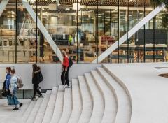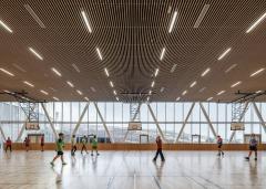 室內(nèi)材料采用了石頭和澆注混凝土,木材與不同的表面結(jié)合后形成了一幅天然的畫布,而外部材料采用了玻璃和鋁板材,為學校的雕塑設(shè)計創(chuàng)造了一個中性背景。