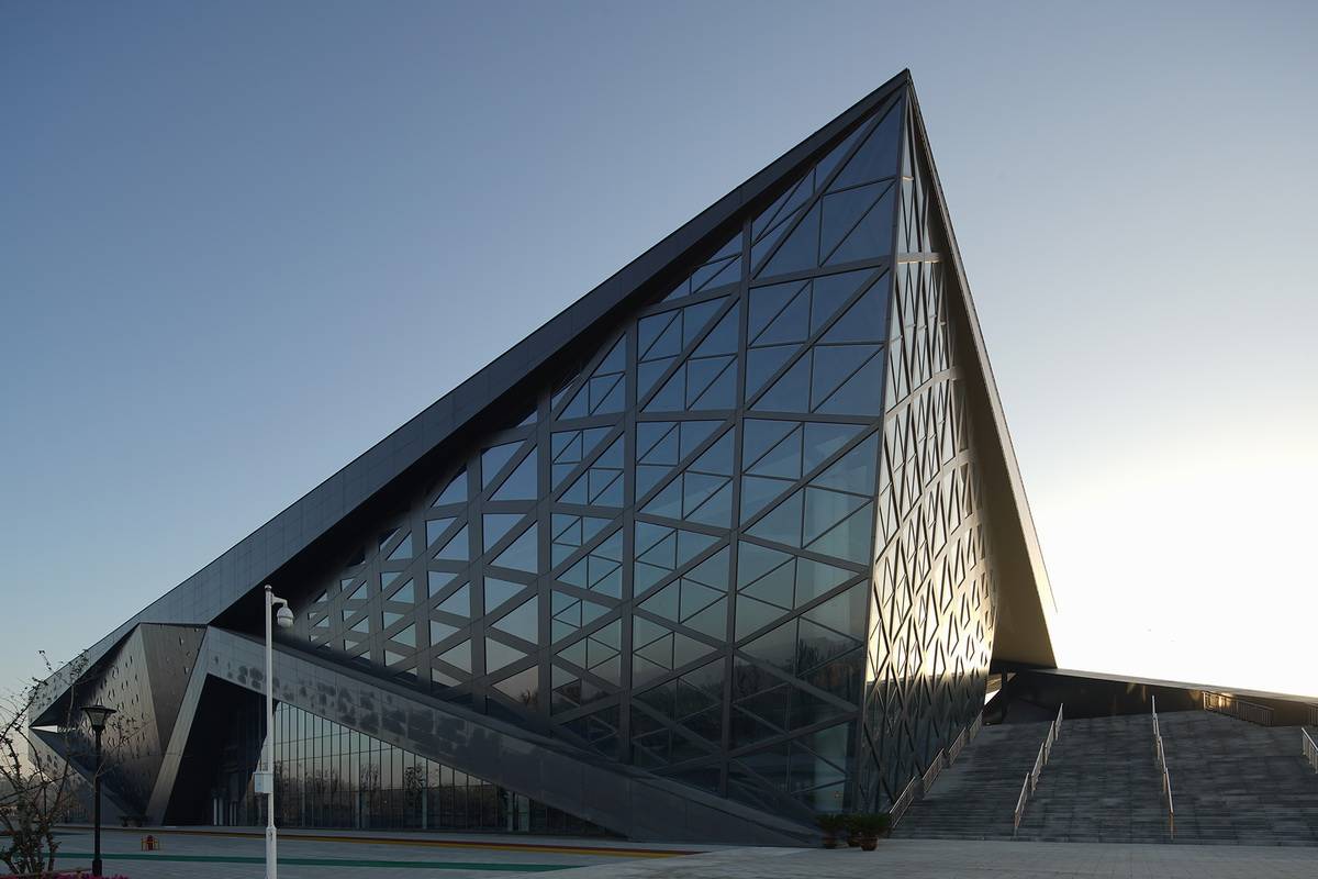 基地用地呈三角形狀,四面臨路。用地坐擁便利的交通資源,可達(dá)性強(qiáng)。且北邊緊靠生態(tài)廊道,擁有較好的生態(tài)環(huán)境。在總體布局上,本設(shè)計(jì)采用大開大合的手法,集中布置場(chǎng)館體量,節(jié)約建設(shè)用地,以讓出開闊的綠地給城市展示廣場(chǎng)及戶外活動(dòng)用地。