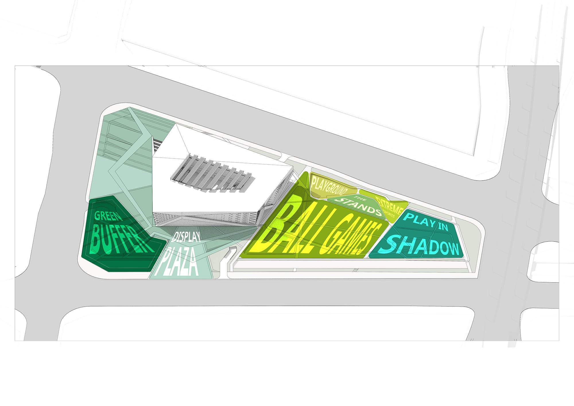 在相對(duì)緊張的用地,如何創(chuàng)造出富有吸引力的公共空間,鼓勵(lì)人與人的交流?如何提升建筑與景觀的互動(dòng),創(chuàng)造有歷史根源并能代表新城發(fā)展的形象?如何定義適合中國未來生活方式的群眾體育建筑類型?我們提出了以下策略: