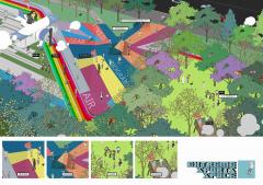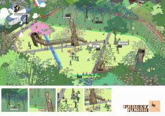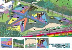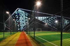 北側(cè)的“運(yùn)動(dòng)森林”為主要的戶外活動(dòng)場(chǎng)地。作為主體建筑與北側(cè)公園的過渡,跑道形成的空間紐帶串聯(lián)起了整個(gè)空間。圍繞中庭在二層有一條空中跑道,跑道同時(shí)通過外部的臺(tái)階與室外的跑道互相串聯(lián),沿著室內(nèi)跑道可以觀賞室內(nèi)的體育活動(dòng),中庭表演,沿臺(tái)階到達(dá)室外又可以享受綠化景色,新鮮空氣。