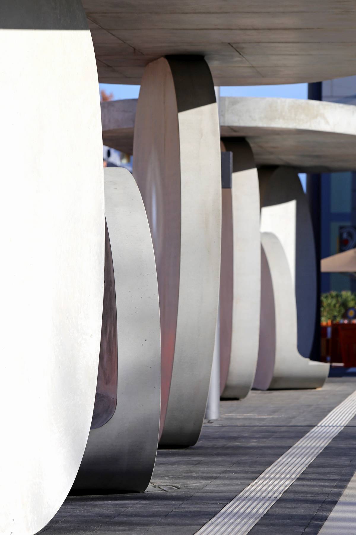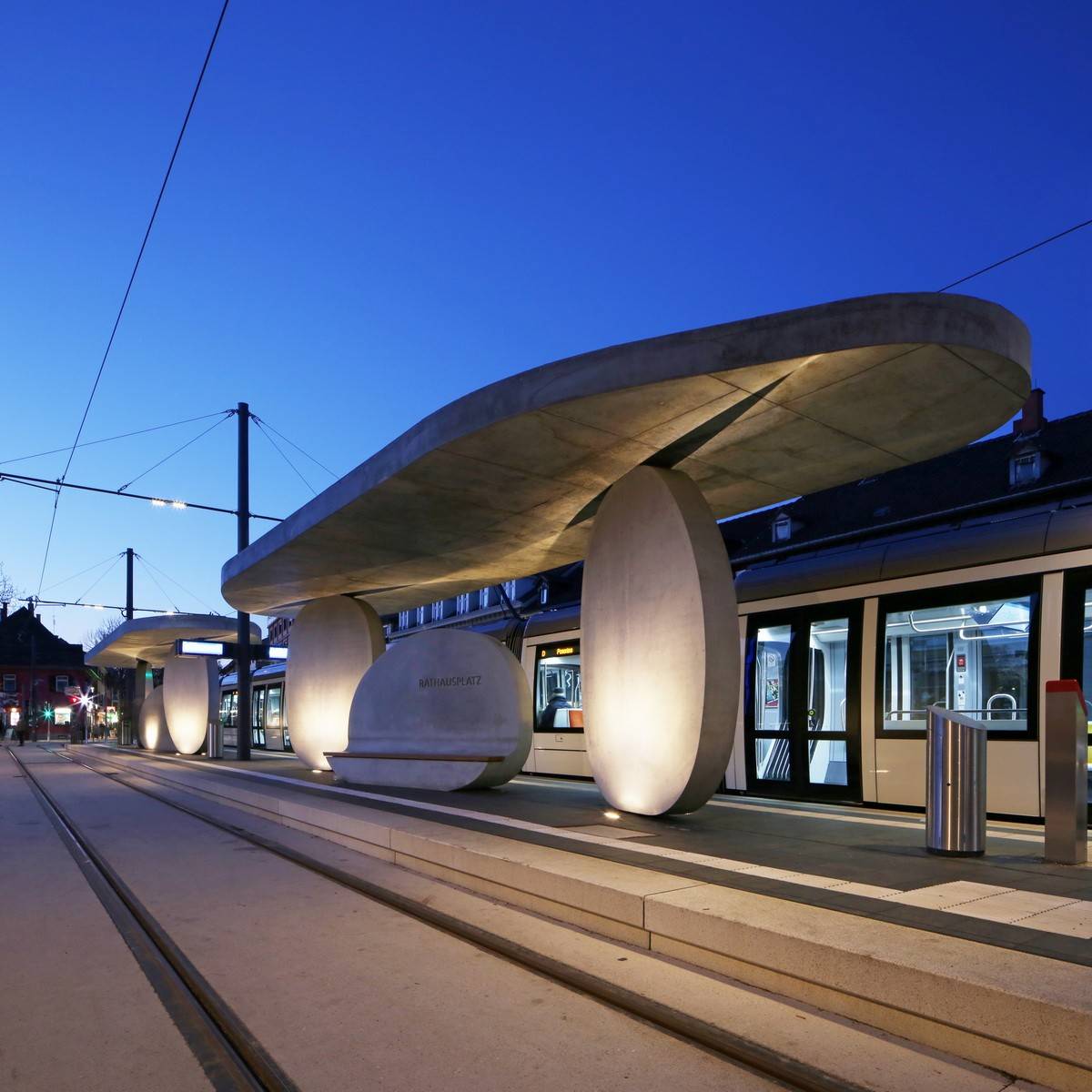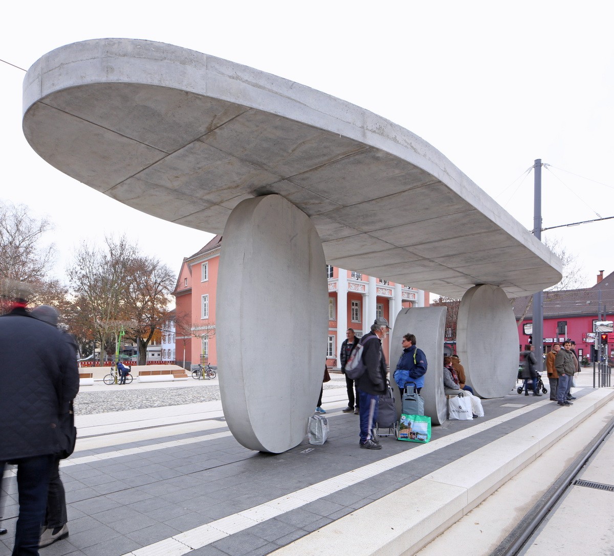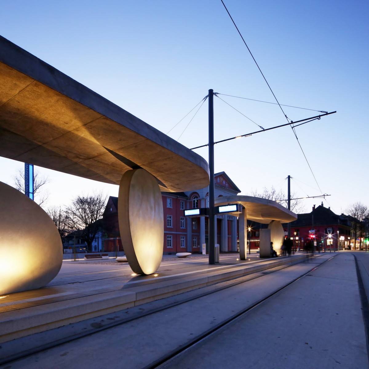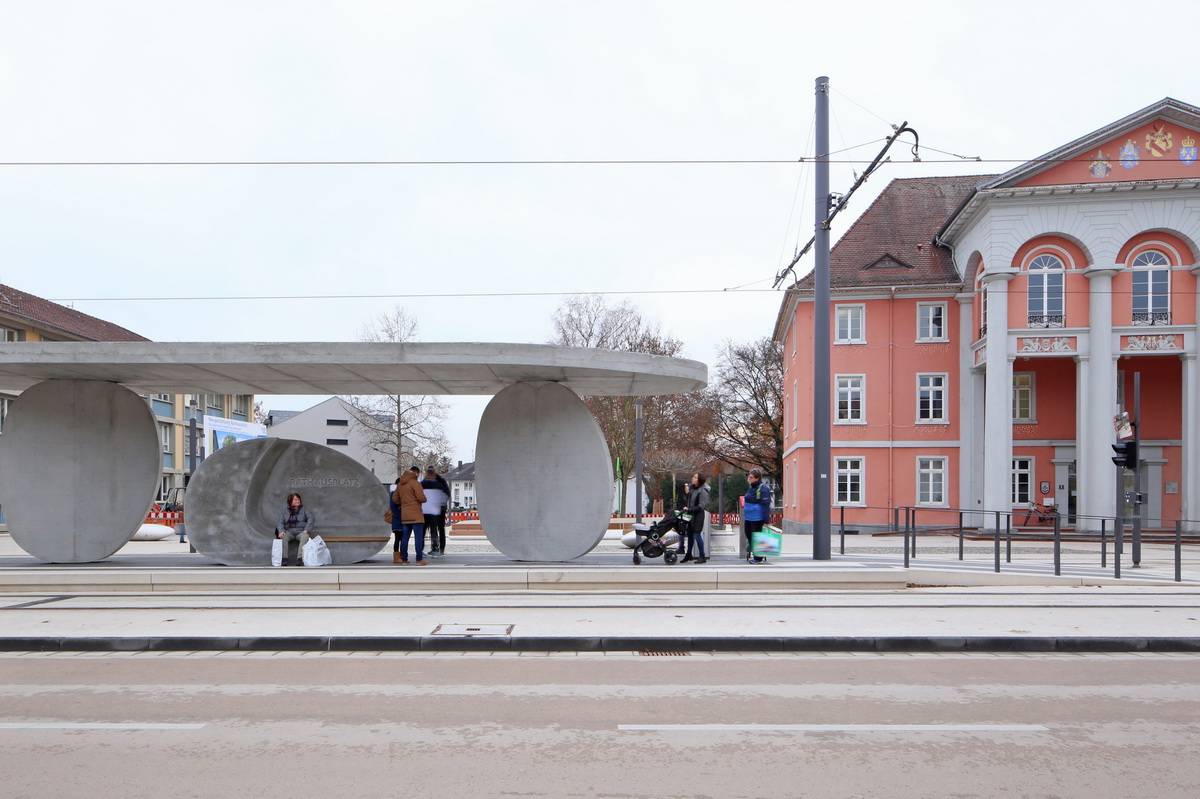 在另一端德國(guó)境內(nèi)的凱爾(Kehl)市政廳,一個(gè)新的車站已經(jīng)被建立完成,這是一個(gè)由裸露混凝土圓盤組成的雕塑般的基礎(chǔ)設(shè)施,交織了動(dòng)感,平衡感,失衡感和流動(dòng)感等。兩座城市,兩個(gè)各有特色的電車站共同串聯(lián)起了“小型邊境交通”的日常。