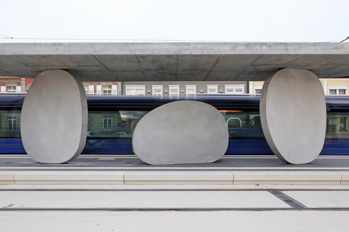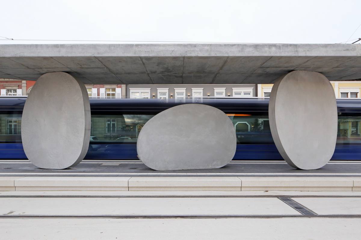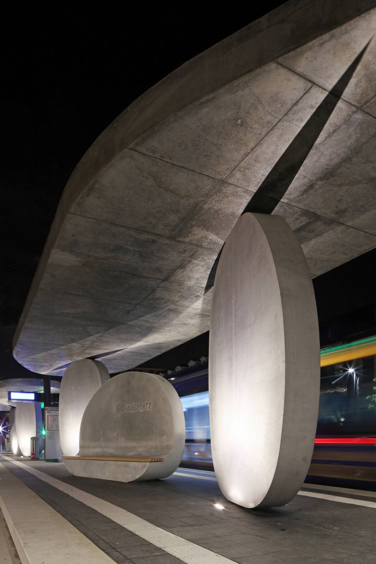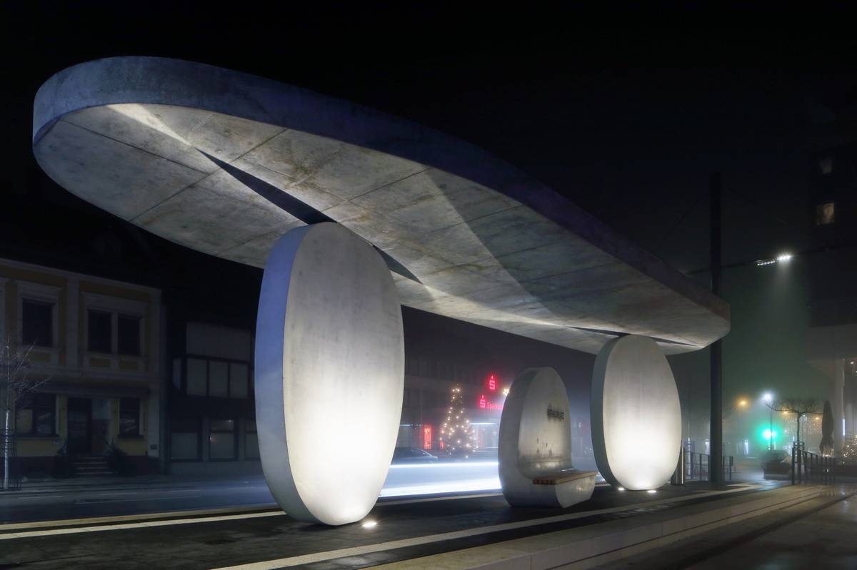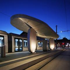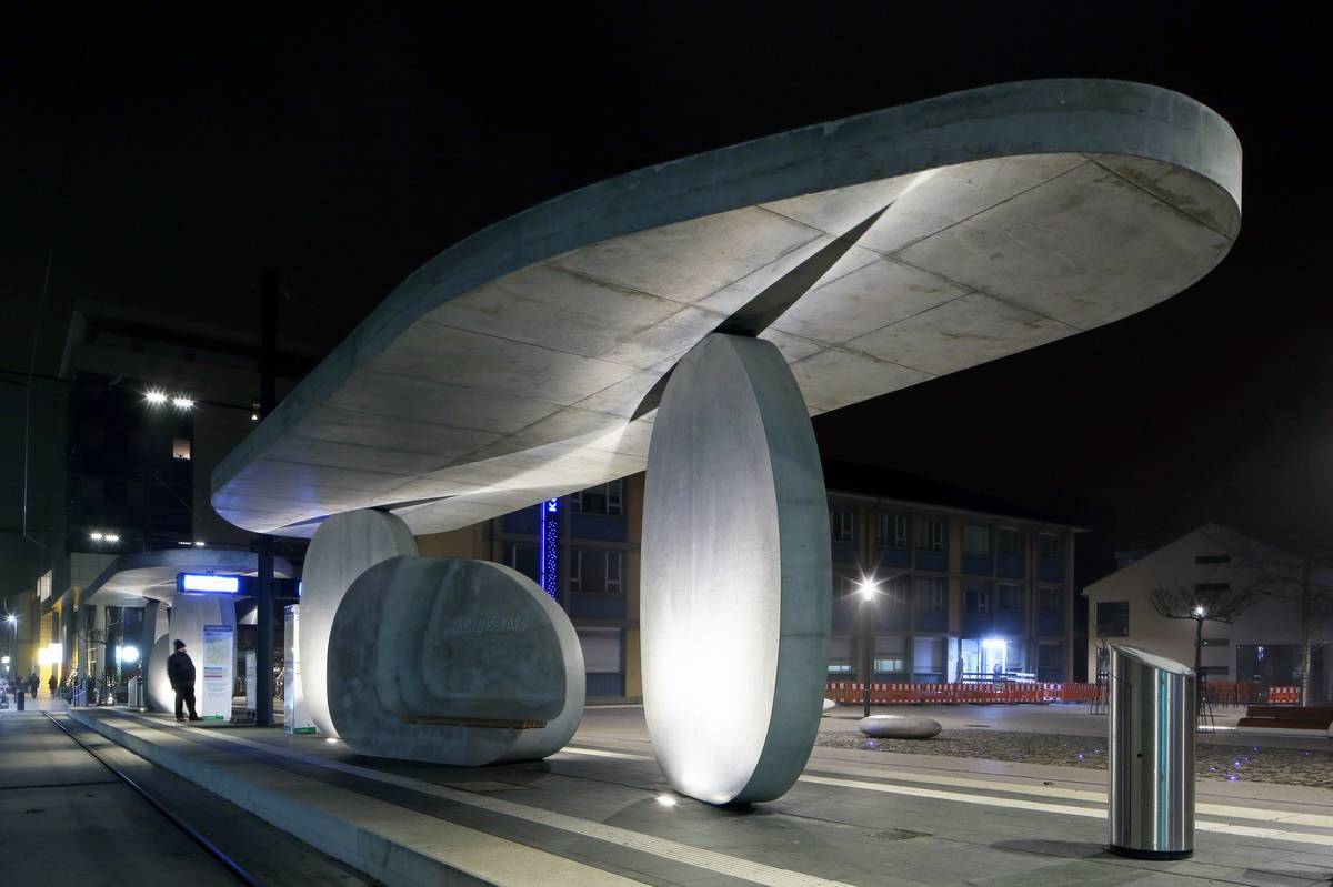 在另一端德國(guó)境內(nèi)的凱爾(Kehl)市政廳,一個(gè)新的車站已經(jīng)被建立完成,這是一個(gè)由裸露混凝土圓盤組成的雕塑般的基礎(chǔ)設(shè)施,交織了動(dòng)感,平衡感,失衡感和流動(dòng)感等。兩座城市,兩個(gè)各有特色的電車站共同串聯(lián)起了“小型邊境交通”的日常。