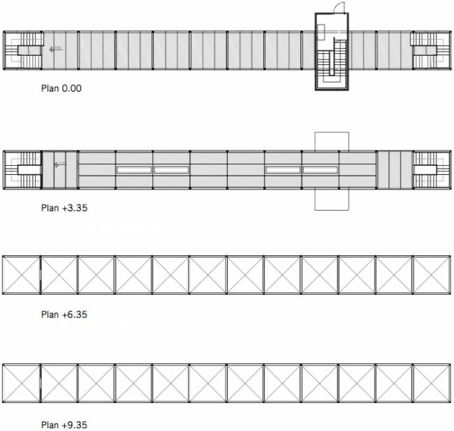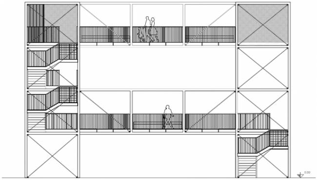 作為觀景臺(tái)的建筑結(jié)構(gòu)被放置在基地的三側(cè)。每個(gè)結(jié)構(gòu)都有自己獨(dú)一無(wú)二的外觀類型和功能,從而相互協(xié)作,共同完善尚未完成的校區(qū)的總體規(guī)劃構(gòu)想。這些觀景臺(tái)結(jié)構(gòu)的擺放位置和開(kāi)放性構(gòu)成了項(xiàng)目的入口,同時(shí)鼓勵(lì)著人們?cè)诨厣贤鶃?lái)穿梭。雖然這些結(jié)構(gòu)被刻意放置在相去甚遠(yuǎn)的位置,但它們?nèi)匀槐舜寺?lián)系。這些結(jié)構(gòu)有的沿著穿過(guò)基地的軸線的延長(zhǎng)線放置,有的位于建筑的附近,不僅可以從園區(qū)的外圍進(jìn)入,園區(qū)里面的人也可以輕易到達(dá)。這種雙入口的設(shè)計(jì)得益于這些觀景臺(tái)結(jié)構(gòu)的進(jìn)深和其上部空間的通透性,從而賦予空間一種運(yùn)動(dòng)性和移動(dòng)性,此外,這些設(shè)計(jì)還為使用者創(chuàng)造了一些大學(xué)校園中難得的溝通交流的空間條件。