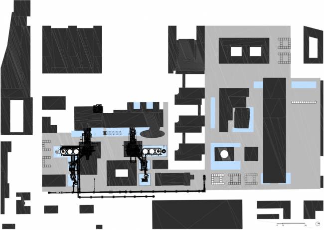 這種特別的空間設(shè)置能夠使參觀者快速地了解整個(gè)基地的環(huán)境,并從不同的角度來(lái)觀察這些工業(yè)時(shí)代的巨大建筑物。實(shí)際上,這些垂直的結(jié)構(gòu)不僅創(chuàng)造了避無(wú)可避的公共空間,還在其內(nèi)部空間中將所有人和環(huán)境聯(lián)系在了一起。但同時(shí),它們又將身處其中的人們與這個(gè)工業(yè)場(chǎng)地短暫地隔離開(kāi)來(lái),使參觀者們得以機(jī)會(huì)能夠重新感受和領(lǐng)悟這個(gè)經(jīng)歷了空間功能翻新和再激活的巨大的工業(yè)區(qū)。
