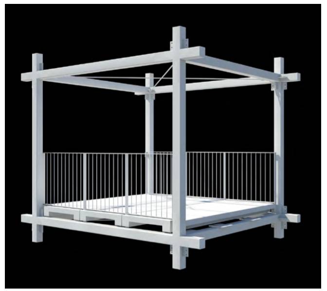 方形截面的白色涂漆桿構(gòu)成3.60m x 3.60 m x 3m的模塊,這些模塊最終組成了本結(jié)構(gòu)的金屬框架。這種被廣泛使用框架在本項(xiàng)目中創(chuàng)造出一種獨(dú)特性,也創(chuàng)造出一種人體尺度與可居住空間尺度之間的雙重關(guān)系。