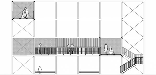 第二個(gè)建筑結(jié)構(gòu)則位于基地主要入口的附近。它的主要功能是顯示信息,向人們傳達(dá)消息,但同時(shí)也設(shè)置了座椅區(qū)和聚會(huì)區(qū)。這兩個(gè)便于使用的結(jié)構(gòu)具有強(qiáng)大的空間功能,同時(shí)也具有極強(qiáng)的靈活性和適應(yīng)性,能夠滿足人們?nèi)找孀兓男枨蟆?/p>
