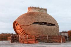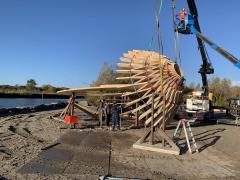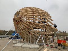 觀鳥屋是根據(jù)白嘴端鳳頭燕鷗的鳥蛋形狀建造在沙巢上的,就像天然的鳥巢一樣?!傍B蛋”的巢由垂直排列的栗木條、蘆葦以及小沙丘構(gòu)成,“鳥蛋”本身則通過參數(shù)化設(shè)計(jì)實(shí)現(xiàn)了形狀、結(jié)構(gòu)完整性、木材尺寸以及開口尺寸之間的良好比例。該結(jié)構(gòu)在工廠預(yù)制完成后進(jìn)行拼裝,以便通過小尺寸的木制單元來實(shí)現(xiàn)較大的跨度。