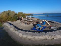 Tij (名字釋義:這是一個(gè)荷蘭語笑話。“Tij”是“潮水”的意思,在該項(xiàng)目中指的是 Haringvliet 水道的回潮,在讀快時(shí)還有“蛋”的意思) 。Tij是2018年11月 Haringvliet 水閘啟用時(shí)設(shè)計(jì)的一系列項(xiàng)目中最大、最引人注目的一個(gè)。