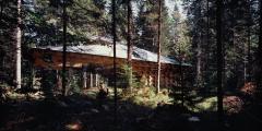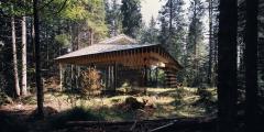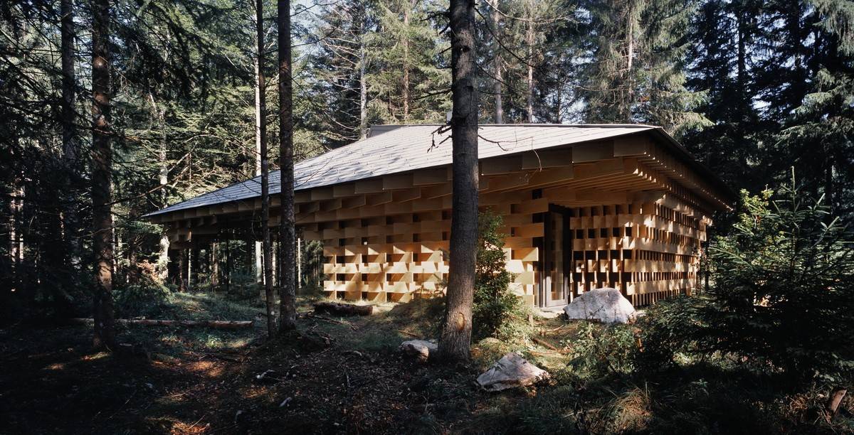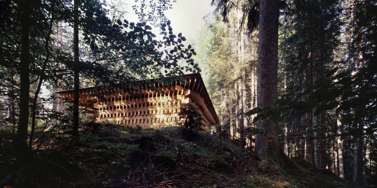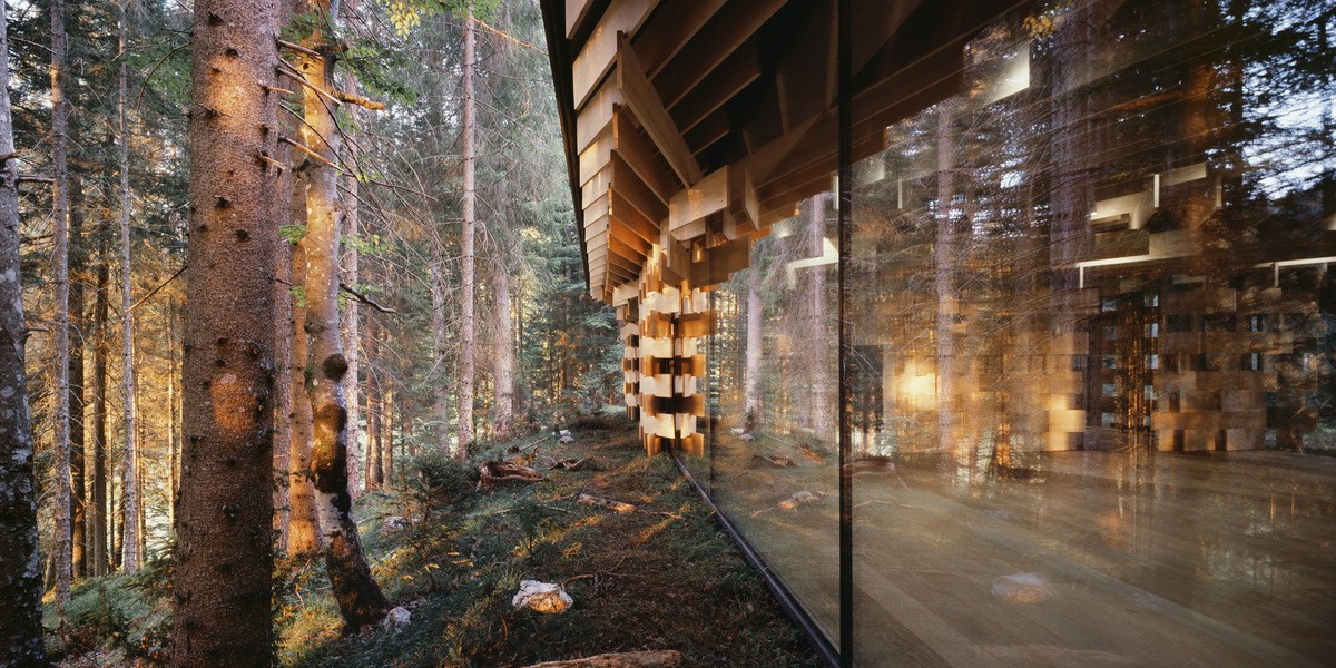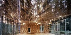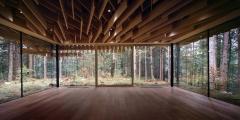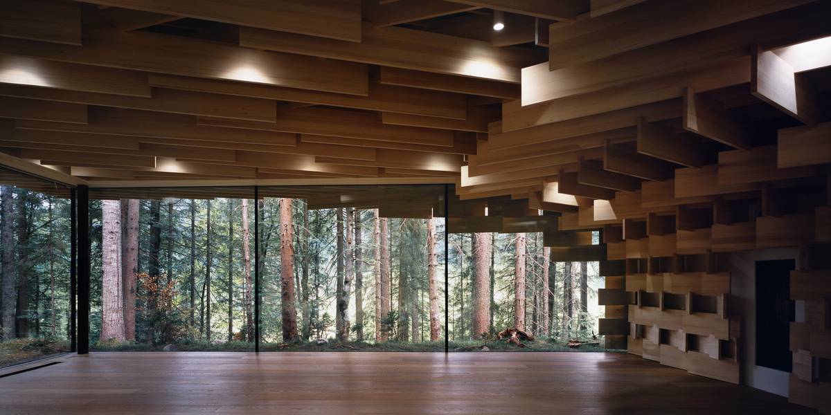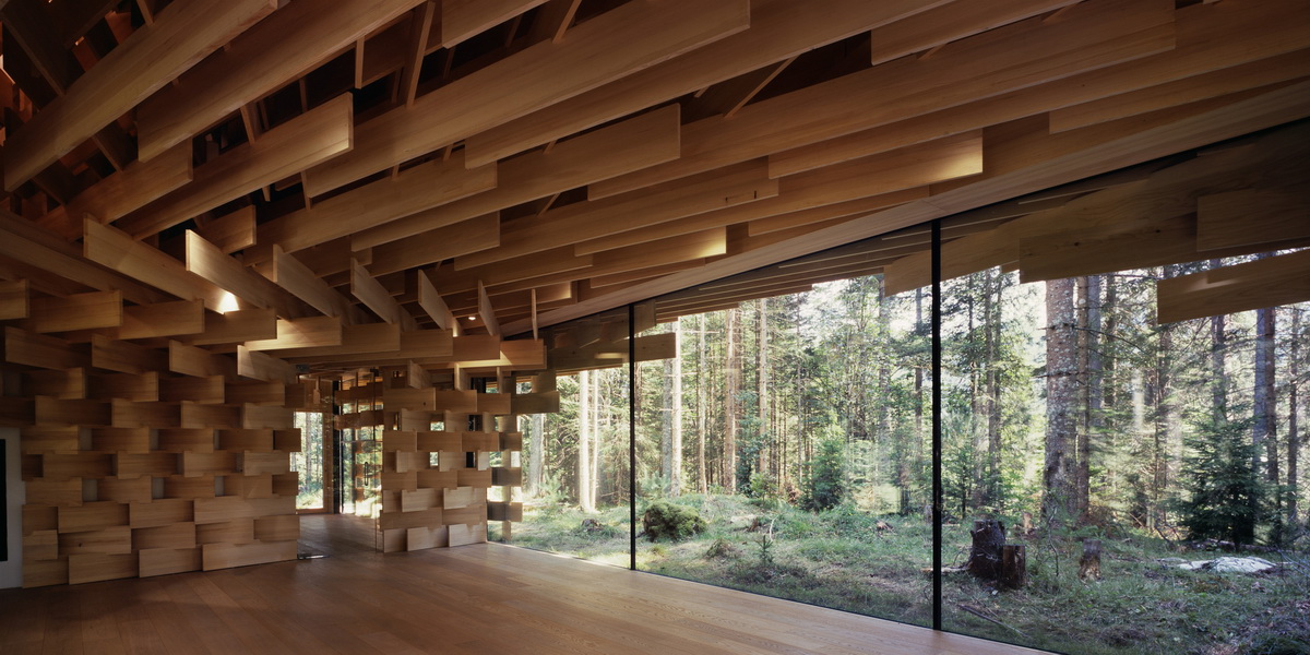 我們所選的場地旁邊就是冷杉樹林,我們把冷杉木材加工成30cm的寬度,然后像樹枝一樣堆疊起來,這樣在大森林和小建筑之間形成了一個(gè)過渡空間。也是人類融入森林的媒介。這些小木板分散了從天窗照射進(jìn)來的光線,就好像陽光或“光線”在森林中經(jīng)常形成的效果。
