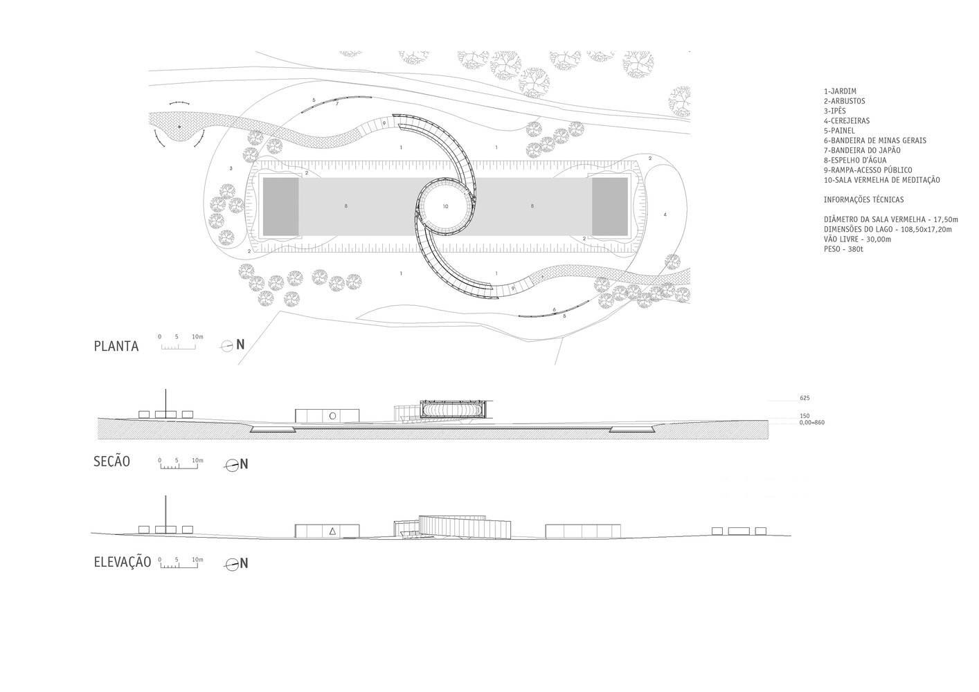 這是一座贊美日本和米納斯吉拉斯州之間友誼的露天博物館,這種友誼能夠建立的具體和非物質(zhì)的東西。設(shè)計(jì)方案是在湖上建造一座橋。這座橋比喻著地域、時(shí)代、思想和理想。湖泊就好像國(guó)與國(guó)之間的大海,也是人類歷史上所面臨的一次來(lái)自征服和生活時(shí)代的挑戰(zhàn)。行動(dòng)和作品通過(guò)在水中出現(xiàn)的醒目日期而變得可見(jiàn),水下空間代表了無(wú)意識(shí)的感覺(jué)和記憶的區(qū)域。