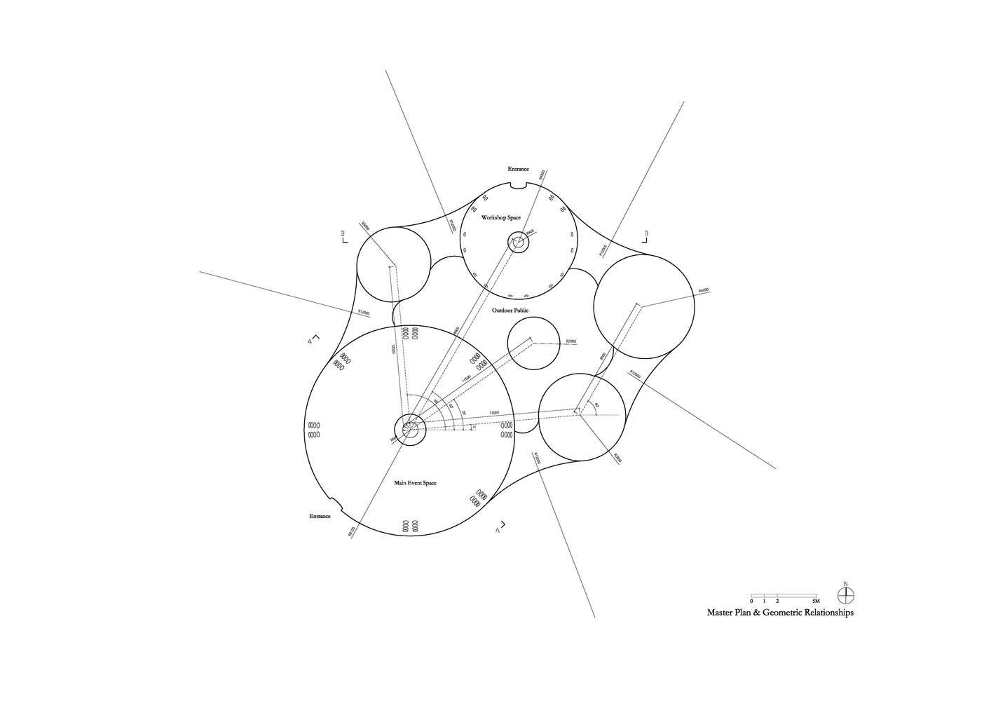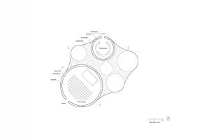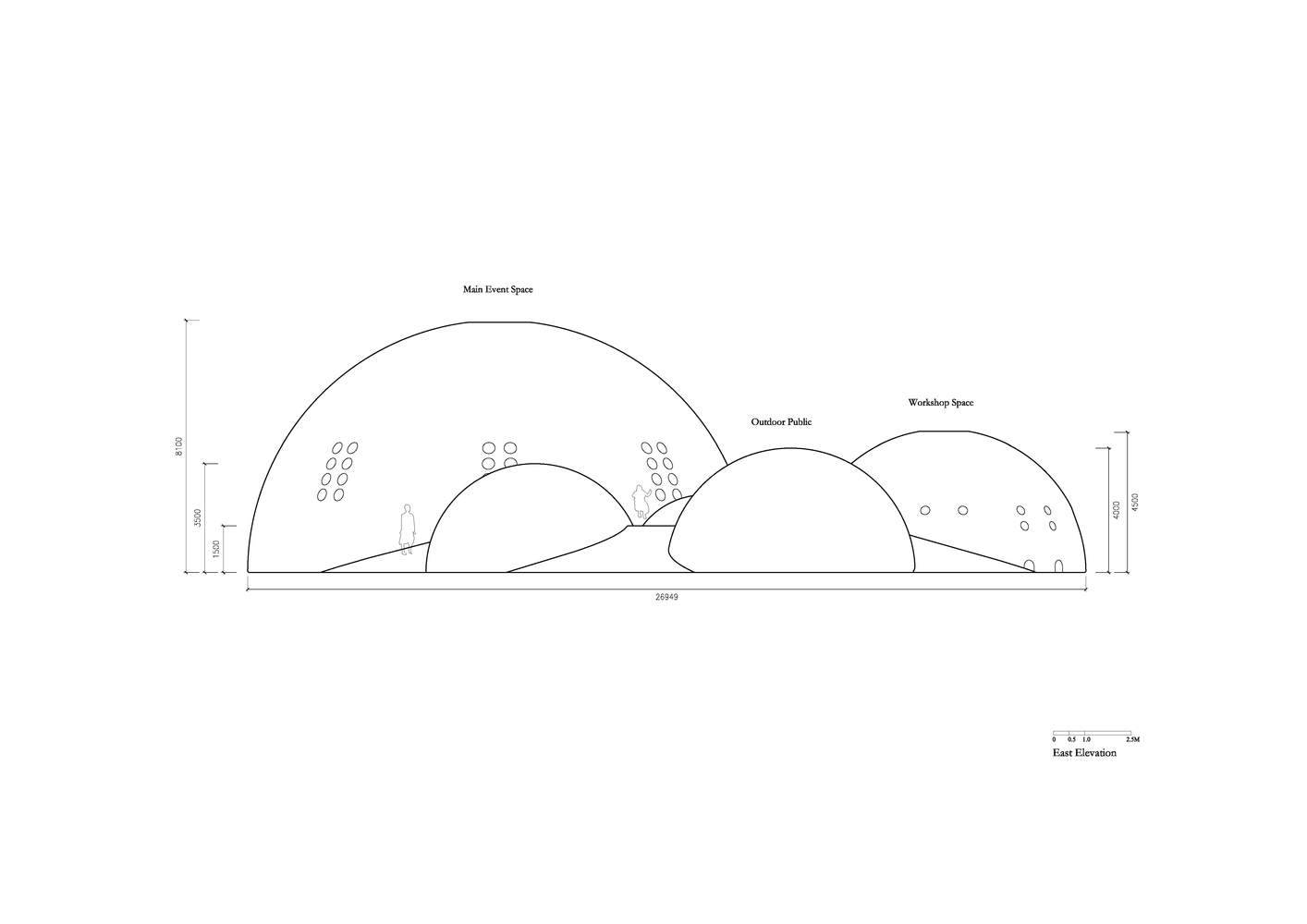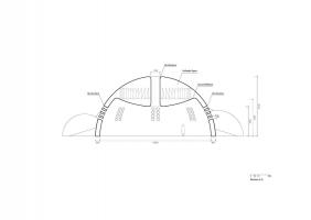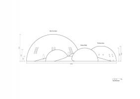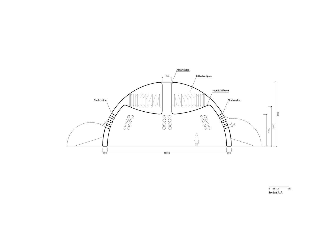 “微生態(tài)幾何”:即建筑從基本幾何形變到最終形態(tài)的過程是基于“環(huán)境/事件”需求的演變而來的??諝馍降膸缀?,運(yùn)用空氣間層作為建筑的結(jié)構(gòu)并形成隔熱層、內(nèi)頂面的反曲面避免聲音聚焦、頂部的孔道形成熱氣導(dǎo)流、側(cè)向的開洞形成空氣對(duì)流。建筑形態(tài)的演化是一種生態(tài)協(xié)調(diào)的概念。
