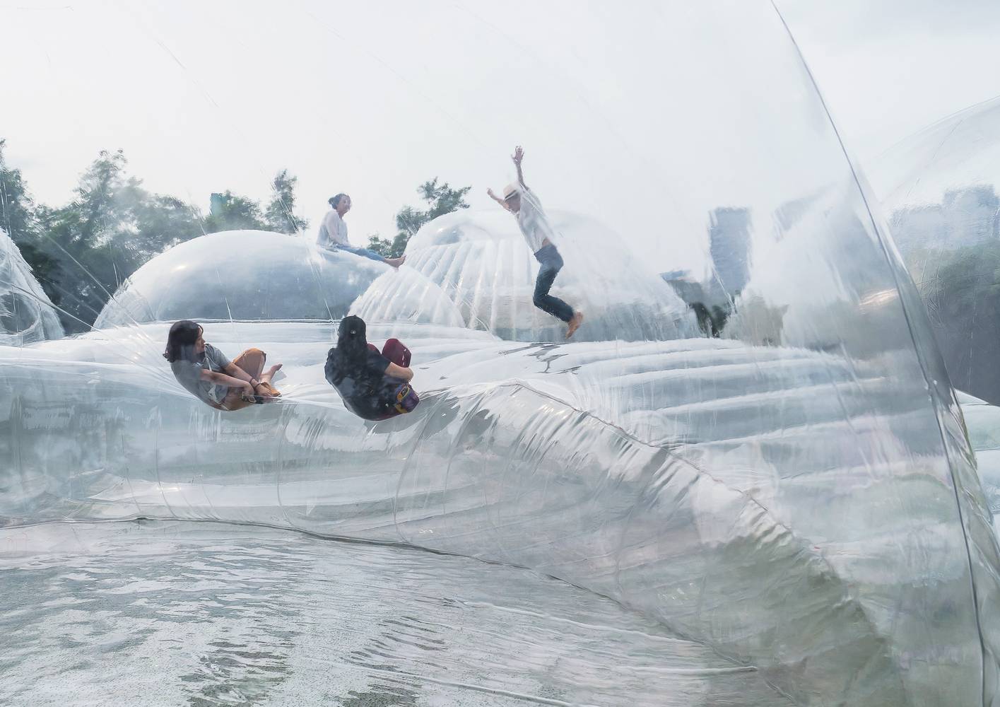 空氣山通過空間的水平關(guān)系和垂直關(guān)系與建筑的透明特征,把不同內(nèi)容、靜態(tài)與動(dòng)態(tài)的行為拉結(jié)在共時(shí)的透視之下,由此產(chǎn)生一種疊合風(fēng)景/事件的視覺關(guān)系。并以此試圖呈現(xiàn)與思索日常中同時(shí)“無限多”在一起的本質(zhì)現(xiàn)象,進(jìn)而讓人預(yù)感一種建筑與自然新關(guān)系的可能性。
